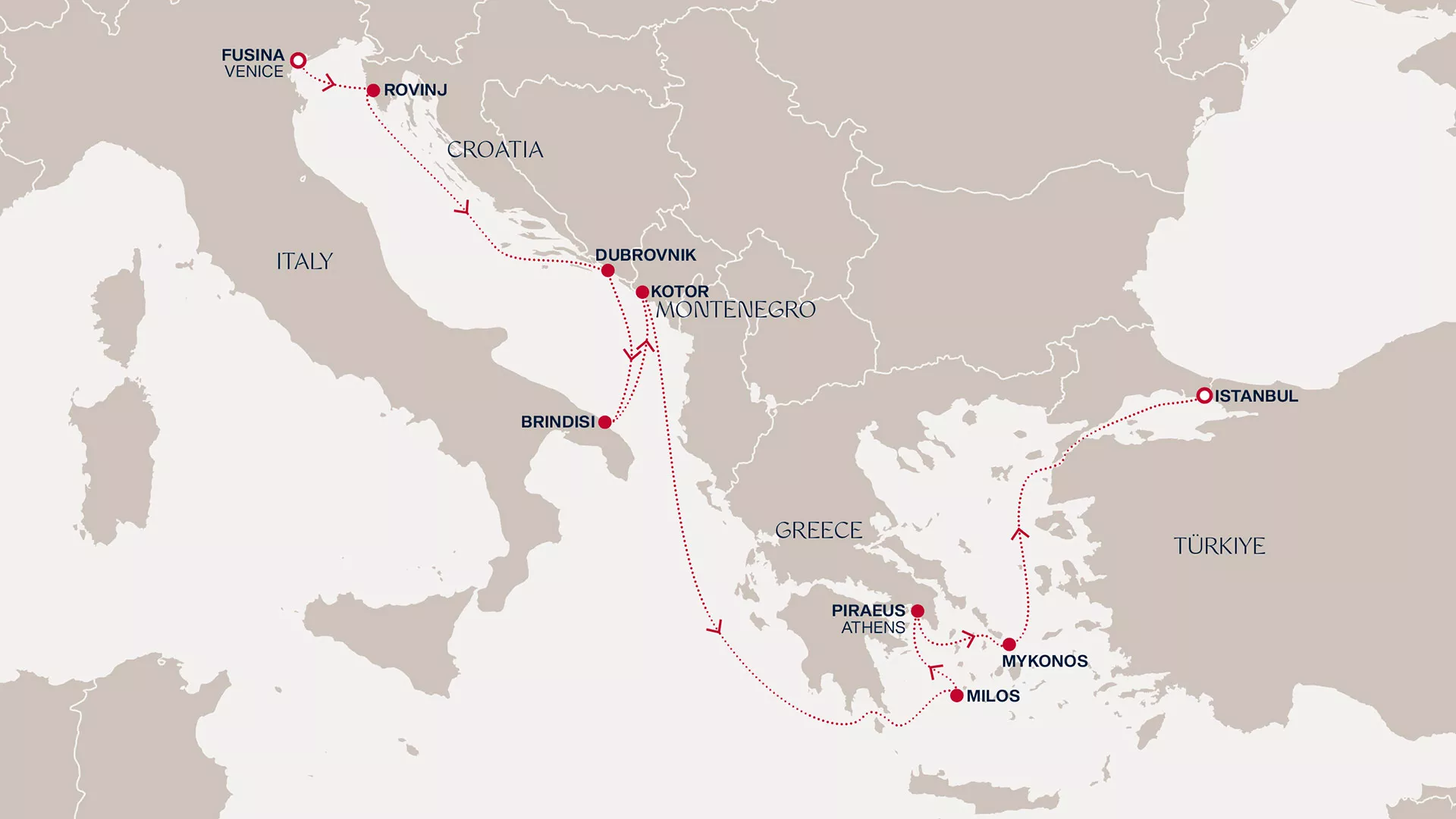 Begin in Fusina, gateway to Venice’s fabled canals, before discovering Rovinj’s pastel-hued harbour and Dubrovnik’s storied walls. Brindisi reveals Puglian warmth, while Kotor’s fjord-like bay captivates beneath dramatic mountains. A serene day at sea precedes Milos’ sculpted volcanic shores and Athens’ timeless legacy from Piraeus. Mykonos sparkles with Cycladic allure before a final relaxing crossing leads to magnificent Istanbul, where continents meet amid domes, minarets, and centuries of imperial splendour.