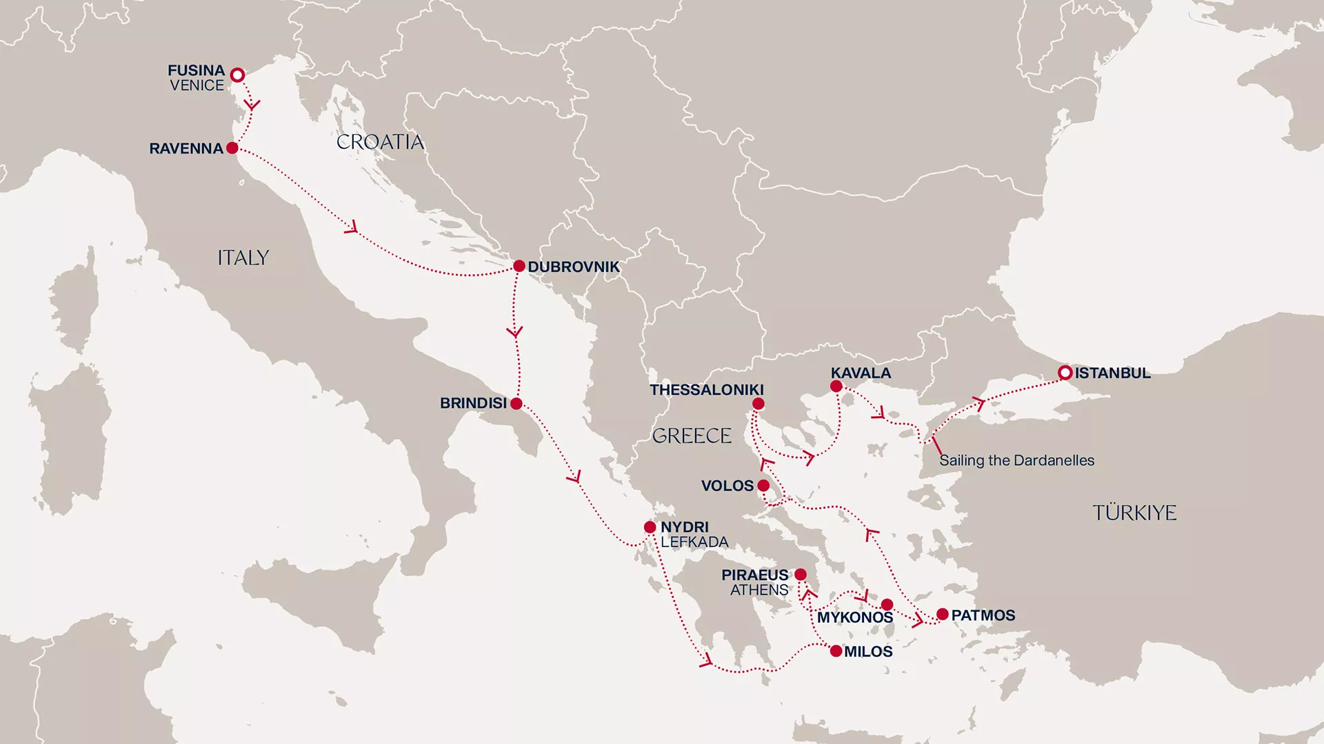 Leave behind timeless Venice and swiftly sail across the Adriatic, pausing in Ravenna, Dubrovnik and Brindisi, then drift into Ionian isles and Cycladic shores. From Athens, the odyssey continues to the breathtaking cliffs of Lefkada and Milos. We reach Mykonos, taking in tangerine sunsets, then Patmos and Volos ease us into indolence and Thessaloniki promises earthly delights. From Kavala, the Dardanelles Strait leads to souks and spices in lievly Istanbul.