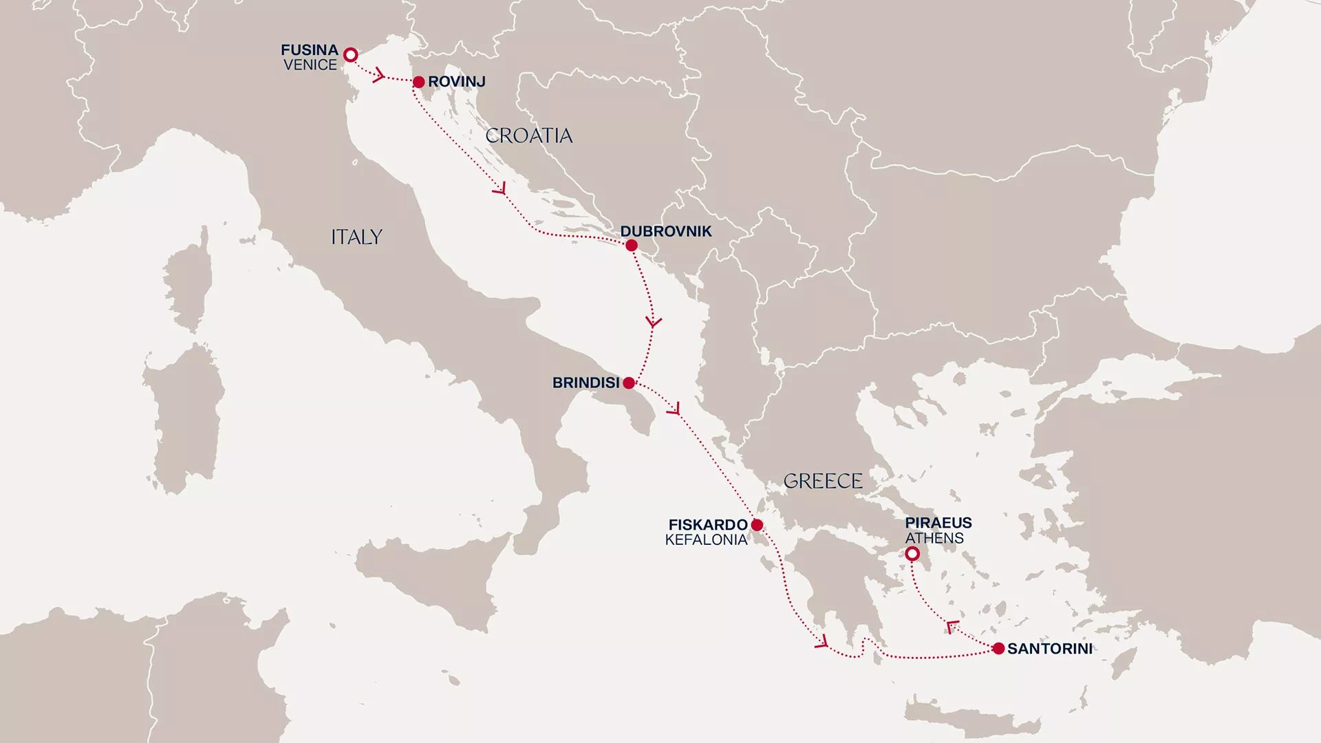 Golden canals wind through gilded palazzos in Venice, a city that warmly invites us to explore its far-reaching heritage as we sail onwards to Rovinj’s charming Croatian sparkle. In Dubrovnik, medieval walls give way to azure waters that stir your soul, and Brindisi opens your heart to Puglia’s historic natural beauty. Explore the quaint harbour of Fiskardo, Kefalonia’s pine-fringed gem and absorb Santorini’s iconic cliffs and caldera views before drawing into the city buzz of Athens.