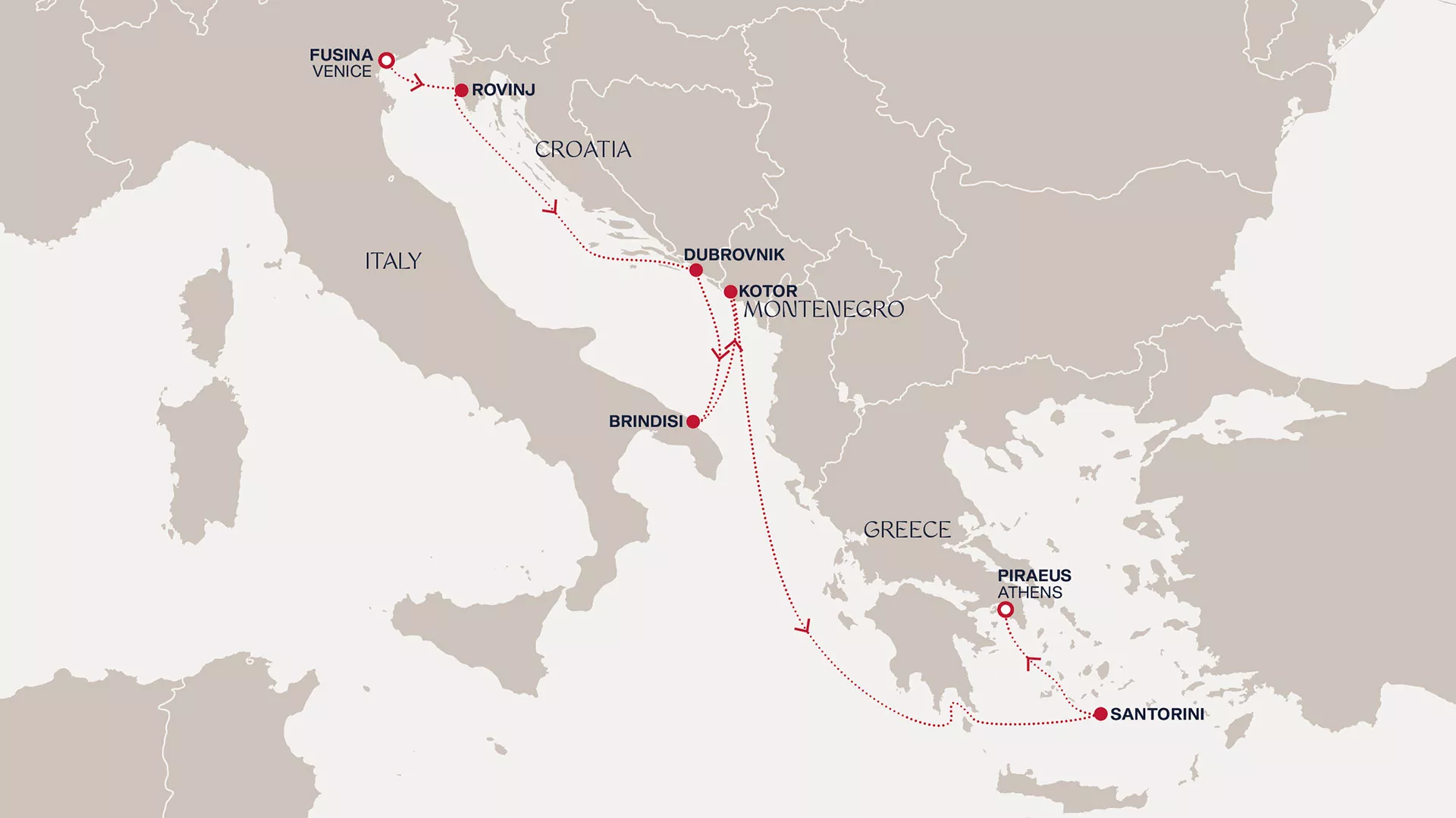 Waltz through Venice’s winding canals and palazzos that tell stories of times gone by, then sail to Rovinj, an Istrian gem with colourful facades and maze-like cobbled streets. In Dubrovnik, explore medieval walls and epic Adriatic views. Discover Brindisi’s blend of Roman history and coastal charm before we glide into Kotor’s fairy-tale fjord. Relish a full day of luxury aboard EXPLORA II, then revel in Santorini’s breathtaking sunset scenery. Finally, Athens greets us with its perfect blend of urban energy and ancient wonder.