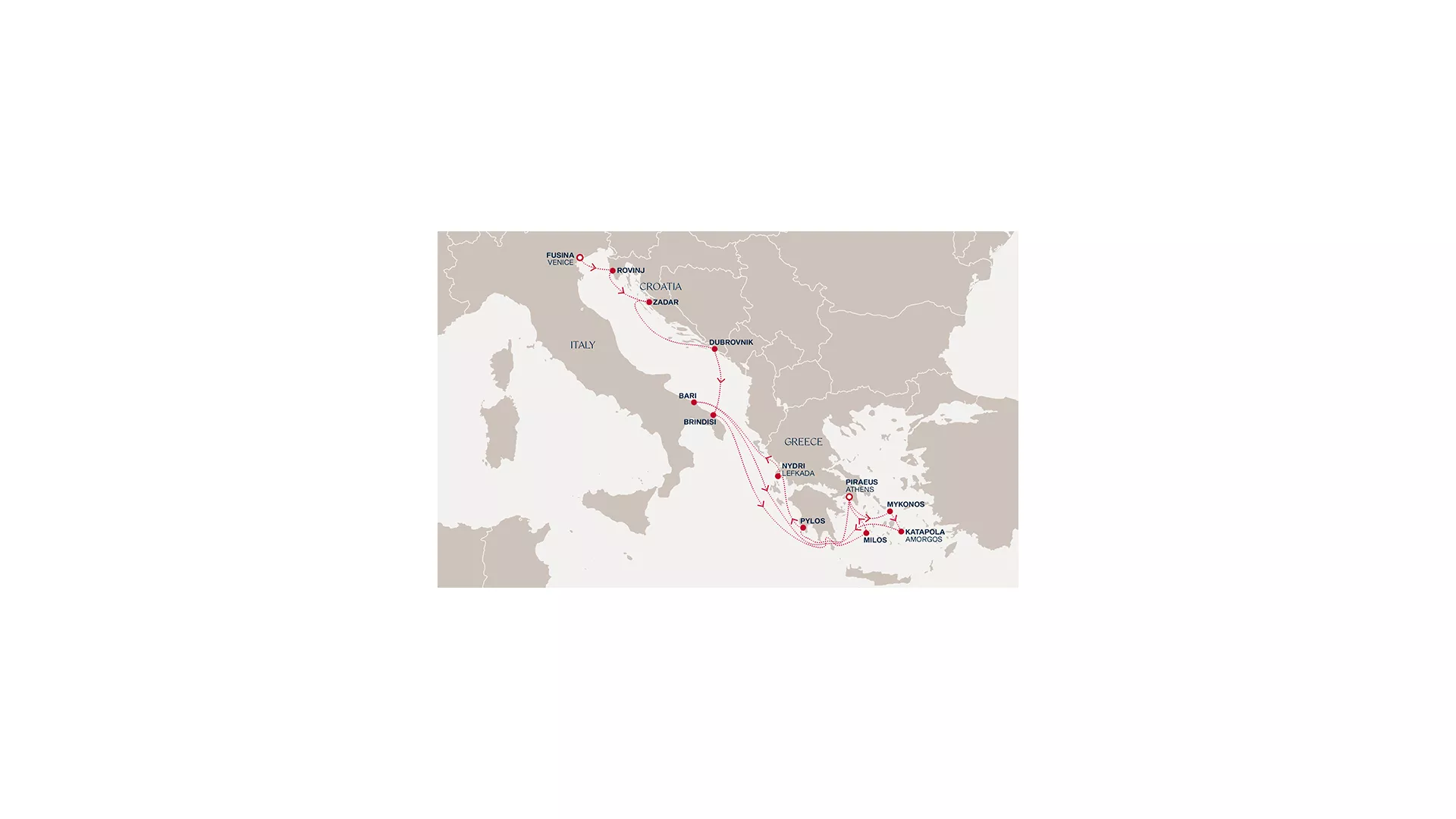Begin in Venice before Rovinj and Zadar reveal the Adriatic’s quiet charm, followed by Dubrovnik’s storied walls and Brindisi’s southern warmth. A serene day at sea leads to Milos’ sculpted beauty and Athens’ timeless energy. Continue through Mykonos’ vibrant spirit and Amorgos’ serene authenticity, then Pylos and Lefkada’s lush landscapes unfold. Bari adds a final taste of Italy before a restful crossing returns you to Athens, enriched by a journey of contrasts, calm, and coastal discovery.