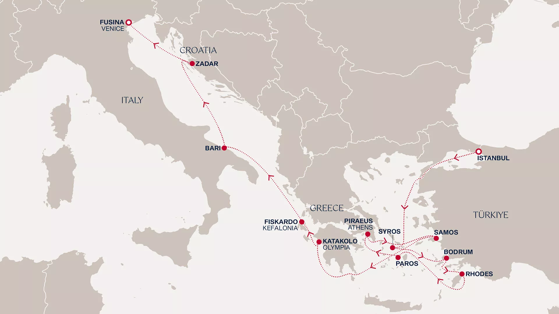 Squeeze through the Dardanelle Strait towards Syros and boho Bodrum, then follow cultural colossi and modern nomads to Rhodes and Paros. Journey from artistic Athens to Venice via the ruins of sleepy Samos with her anthology of ancients, and storied Katakolo, where Olympian legends were born; calling in at Corelli’s Kefalonia, red-roofed Zadar and Venice.