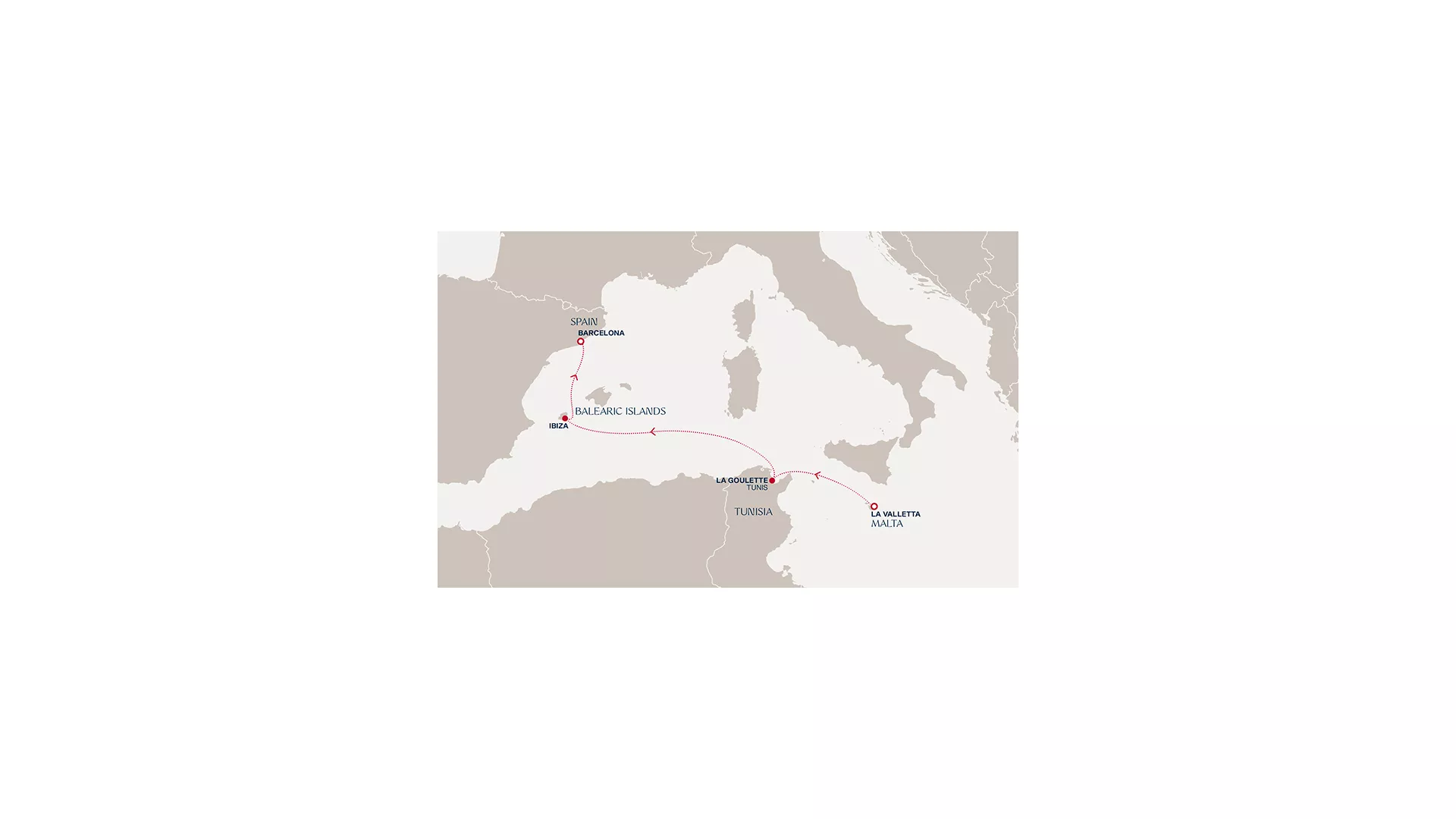 Begin amid the honey-coloured bastions of Valletta, then sail to the medinas, mosaics and Carthaginian echoes of Tunis, where North Africa’s rich heritage comes alive. Relish time at sea for unhurried exploration before Ibiza beckons with free-spirited energy, hidden coves and restorative calm. Finally, we drift into Barcelona’s creativity, cuisine and Catalan soul.