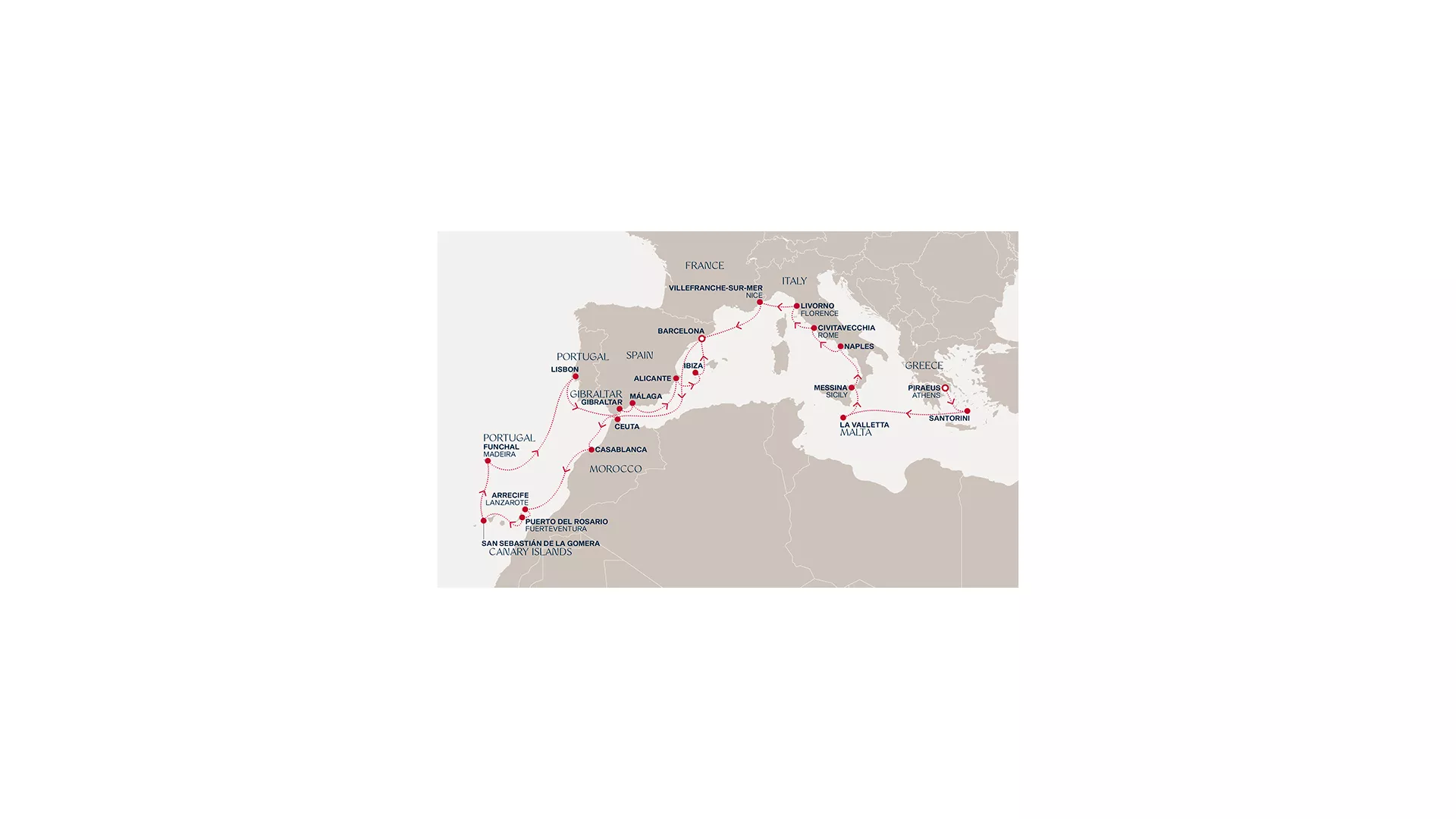 Begin in Athens before Santorini sets a striking Aegean tone. Crossing west, Valletta, Sicily and Naples reveal a rich succession of cultures, followed by Rome, Florence and the Riviera’s refined coastline. From Barcelona, the route turns toward North Africa, where Ceuta and Casablanca introduce a new perspective. The Atlantic unfolds through the Canary Islands and Madeira, each with its own distinct character, before Lisbon’s historic streets. The journey continues along Iberia’s southern coast, returning to Barcelona after a sweeping passage through the Iberian Peninsula
