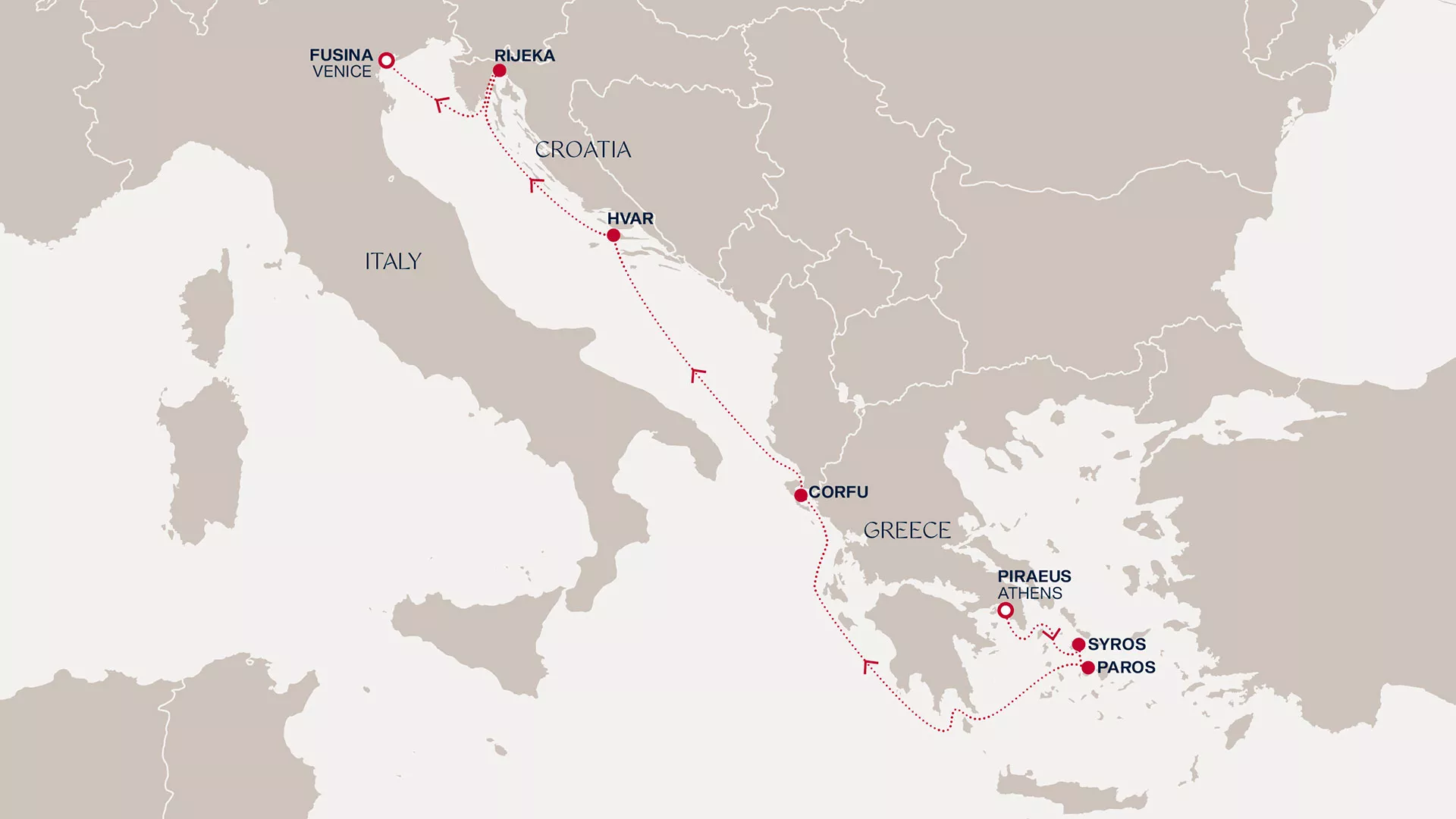 From the ancient and modern marvels that combine to create Athens’ urban energy, we drift to Syros to savour neoclassical elegance along sun-dappled shores. Meander through pretty Paros villages and discover the spirit-lifting atmosphere of Corfu’s Ionian landmarks before embracing Hvar’s lively Croatian attractions and Venetian castle. Absorb the baroque beauty and pebbled shores of Rijeka, then bask in the enchantment of liquid-gold Venice.