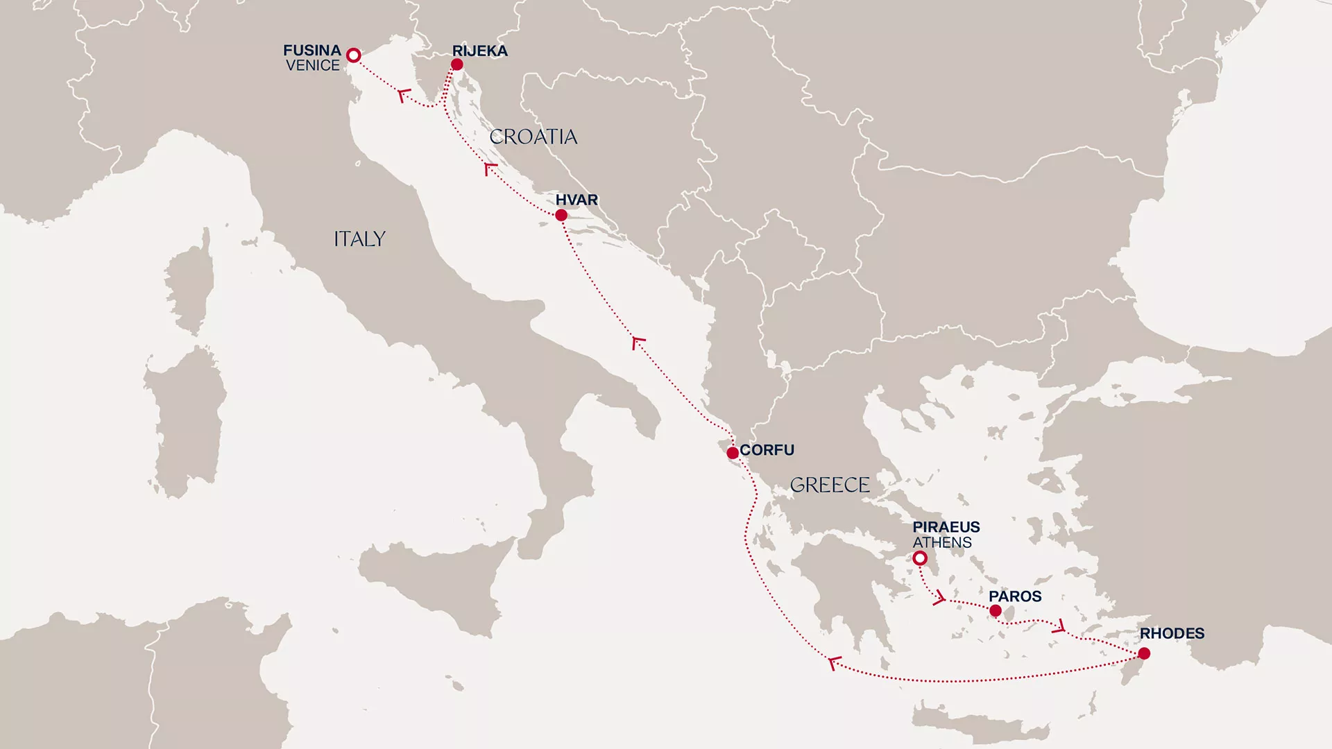 Starting with the dramatic scenery of Athens, where ancient temples create a timeless backdrop to the dynamic city, we drift to the powder-gold sands and sweet villages of Paros. In Rhodes, surround yourself in past times and mythology as you wander the stone paths, then absorb the olive-dotted landscapes of Corfu and lavender-scented hills of Hvar. Then into Rijeka to admire Croatia’s architectural splendour, and round off your adventure among the romantic canals and enchanting piazzas of Venice.
