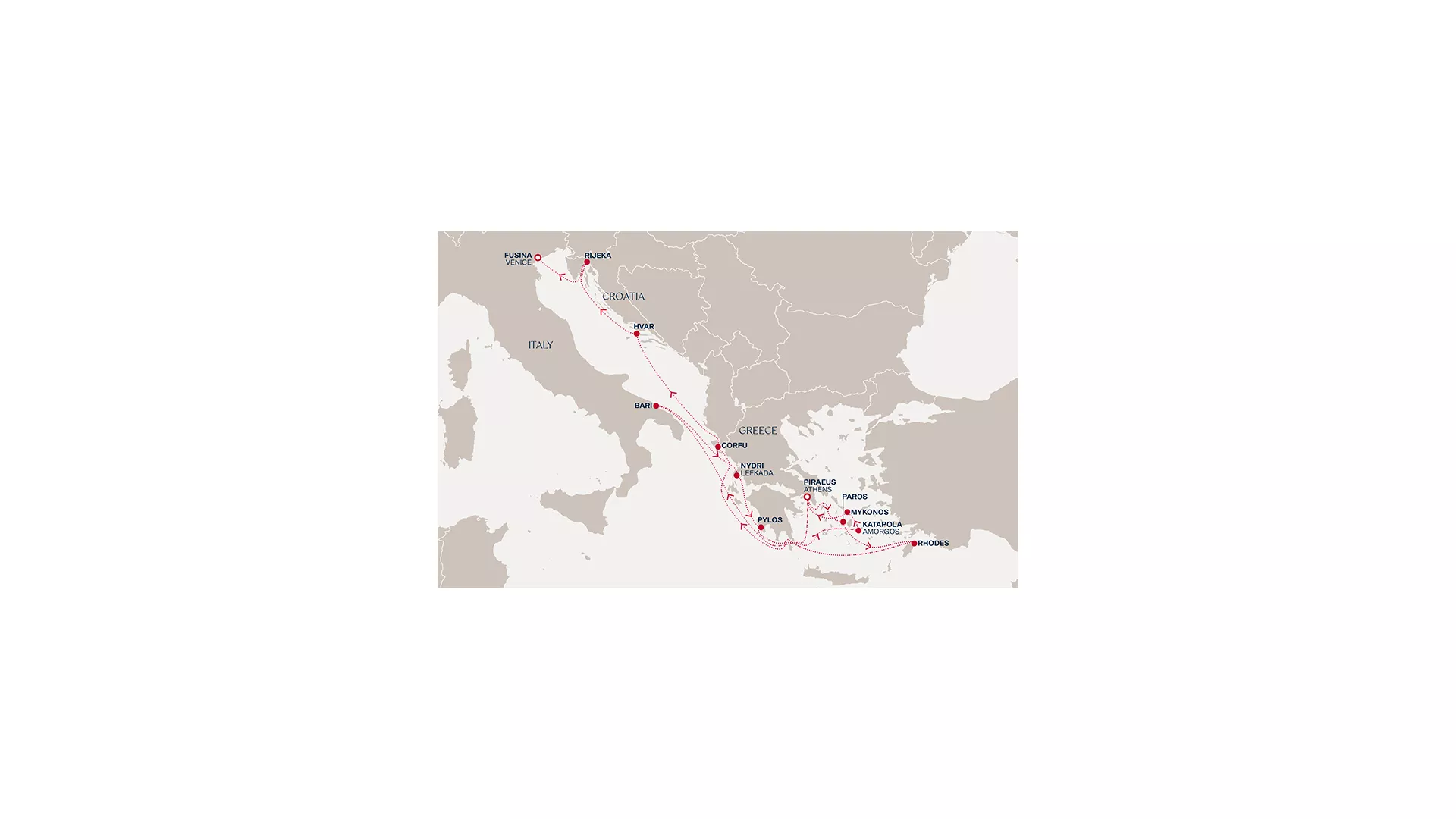 Begin in Athens before sailing to Bari, where southern Italian life unfolds along lively waterfronts and historic streets. In Lefkada, forested hills meet luminous waters, while Pylos offers a quieter glimpse of Greece shaped by history and nature. Amorgos reveals a raw, unhurried beauty, followed by Mykonos’ effortless energy. Returning to Athens, the journey continues to Paros’ laid-back charm and Rhodes’ storied past. Corfu’s Venetian elegance, Hvar’s sunlit vibrancy, and Rijeka’s cultural depth lead to a graceful finale in Venice.