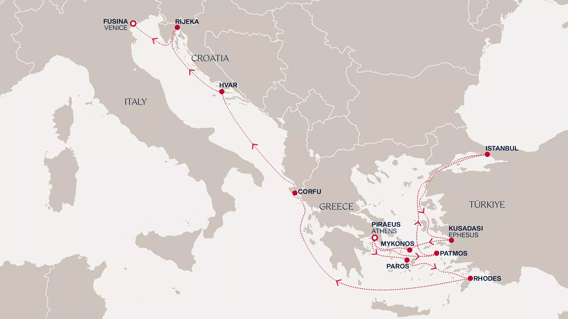 From the legendary shores of Athens, set sail for the peaceful isle of Patmos, then on to Istanbul’s soaring minarets and lively bazaars. Wander through the ancient ruins of Kusadasi’s Ephesus and experience Mykonos' lively charm before returning to Athens. Then explore Paros’ golden beaches, Rhodes’ medieval lanes and Corfu’s lush hills. Discover Hvar’s Adriatic sparkle, Rijeka’s architectural splendour and complete your journey among the glorious canals of Venice.
