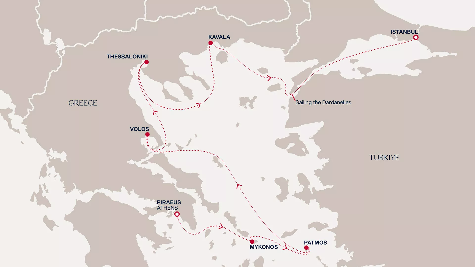 Sail to volcanic islands in a sky-blue sea and the sculpted shores of the Aegean into the Dardanelle Strait. Our first fire giant is Mykonos, where searing sunsets and nightlife sizzle until dawn. The fiery tempo continues in Patmos, once the exile isle of Saint John, now the ultimate vision of summertime ease, before the lyric of the sea carries us to Volos to perfect the art of sipping tsipouradiko. In the lush light of dawn, Kavala glows like an amphitheatre rising from the sea where the Imaret Mohammed was born and Apostle Paul once preached.