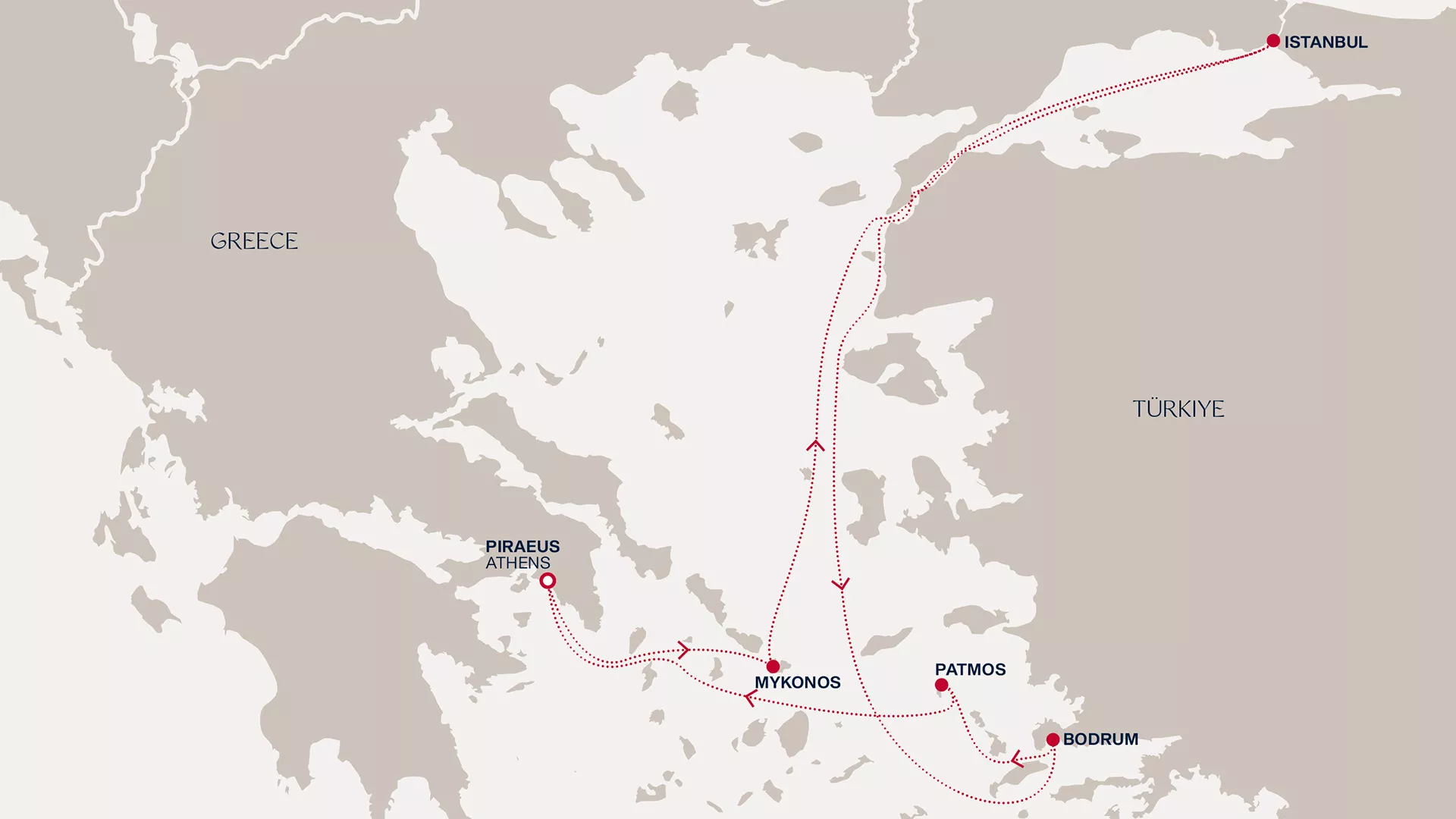 Begin in Piraeus, gateway to Athens’ ancient splendour, before Mykonos dazzles with whitewashed charm and sapphire seas. A serene day at sea leads to spellbinding Istanbul, where minarets, palaces, and bustling bazaars reveal centuries of imperial grandeur across two continents. Continue to Bodrum’s sunlit shores and castle-crowned harbour, then find quiet reflection in Patmos, steeped in spiritual heritage. Return to Athens enriched by a voyage woven with myth, empire, and the timeless beauty of the Aegean.