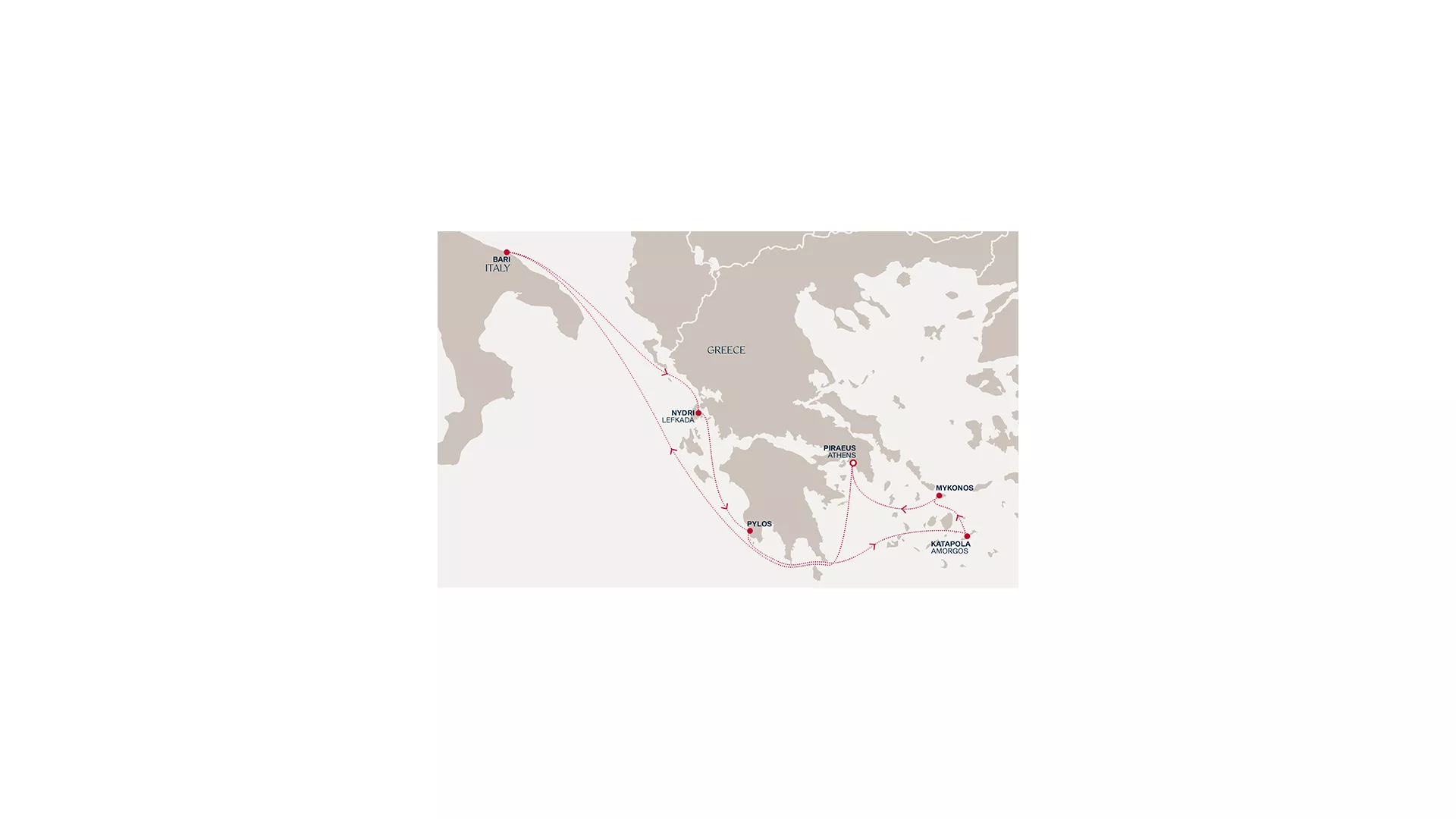 Begin in Athens, where ancient heritage meets vibrant modern life, before a peaceful day at sea sets the tone for discovery. Bari welcomes with southern Italian charm, followed by Nydri’s lush landscapes and emerald waters on Lefkada. In Pylos, history and natural beauty unfold along a tranquil coastline, before Amorgos enchants with its serene authenticity in Katapola. Mykonos adds a touch of cosmopolitan energy, before returning to Athens, enriched by a journey of contrasts and timeless allure.