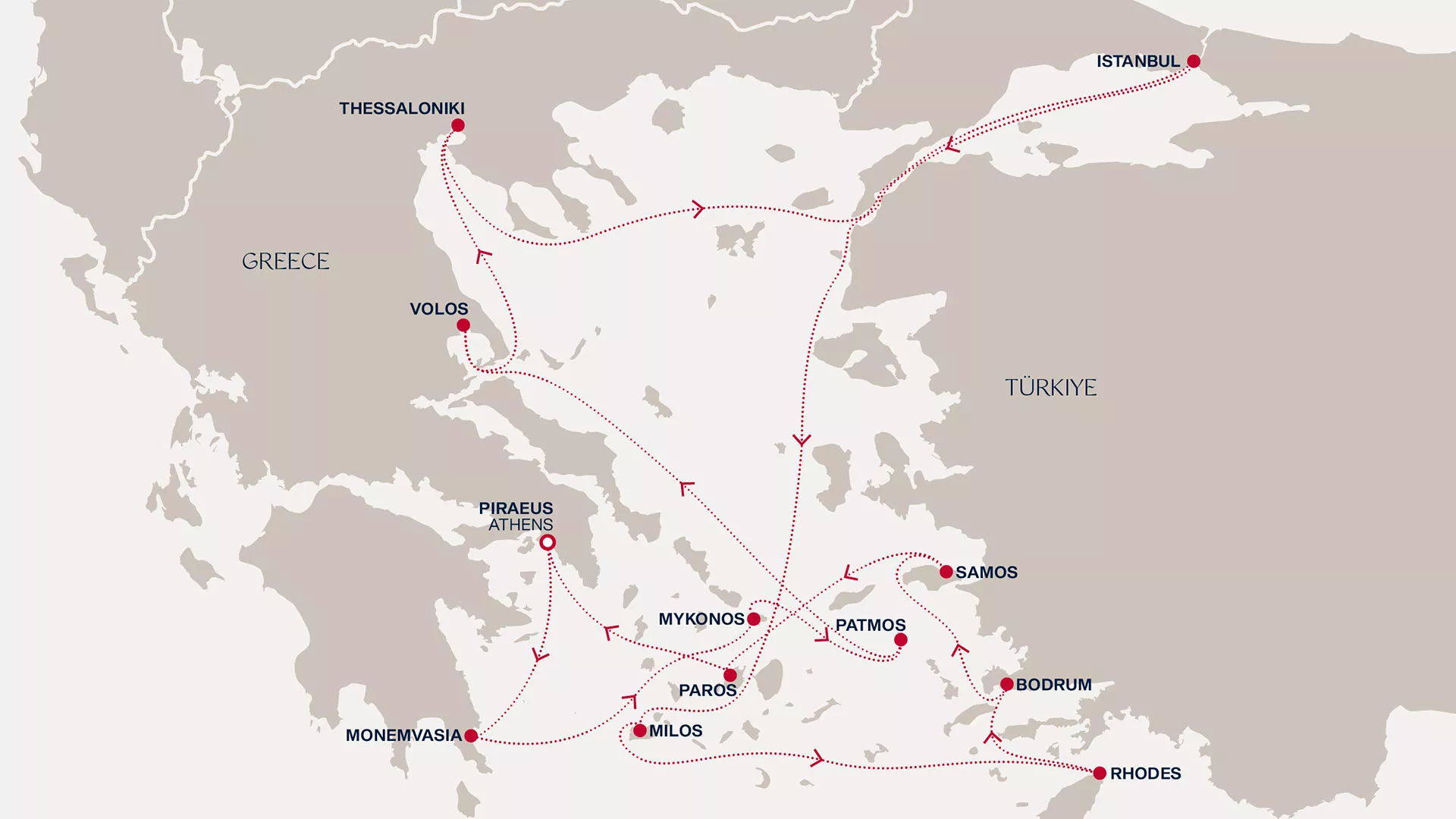 Athenian blessings accompany us to medieval Monemvasia and white-walled Mykonos, before the Aegean reveals the saintly shores of Patmos, legendary origins in Volos and ancient ruins in Thessaloniki. Black-sand beaches and cavernous calderas await in Milos after the wheeling minarets of Constantinople, then we circle scattered islands and sublime shores in the Cyclades and Dodecanese as mighty Athens finally reappears.