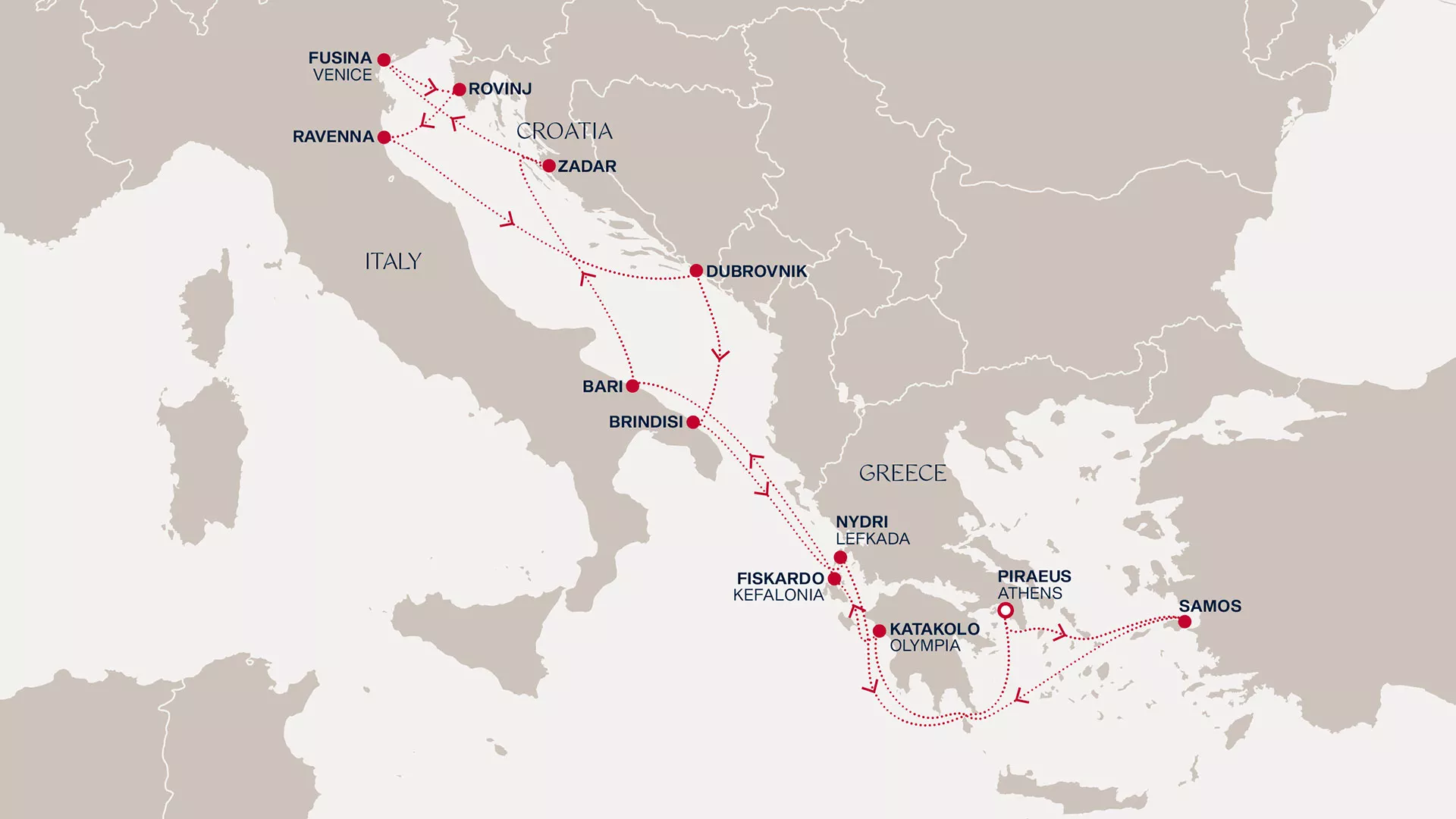 Dubrovnik, before exploring Brindisi’s lively lungomare and Lefkada’s olive-strewn hilltops, as Athens awaits.
