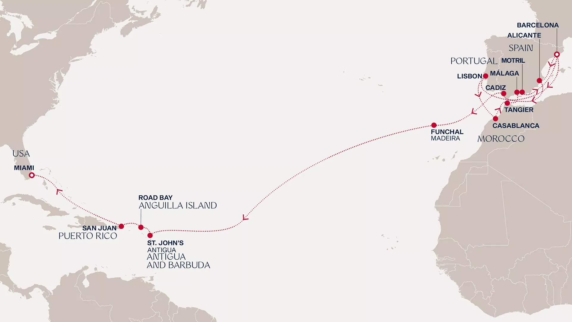 shores of Motril. Venture to Cádiz’s charming old town and Madeira’s blossoming landscapes. Cross the Atlantic to Antigua’s