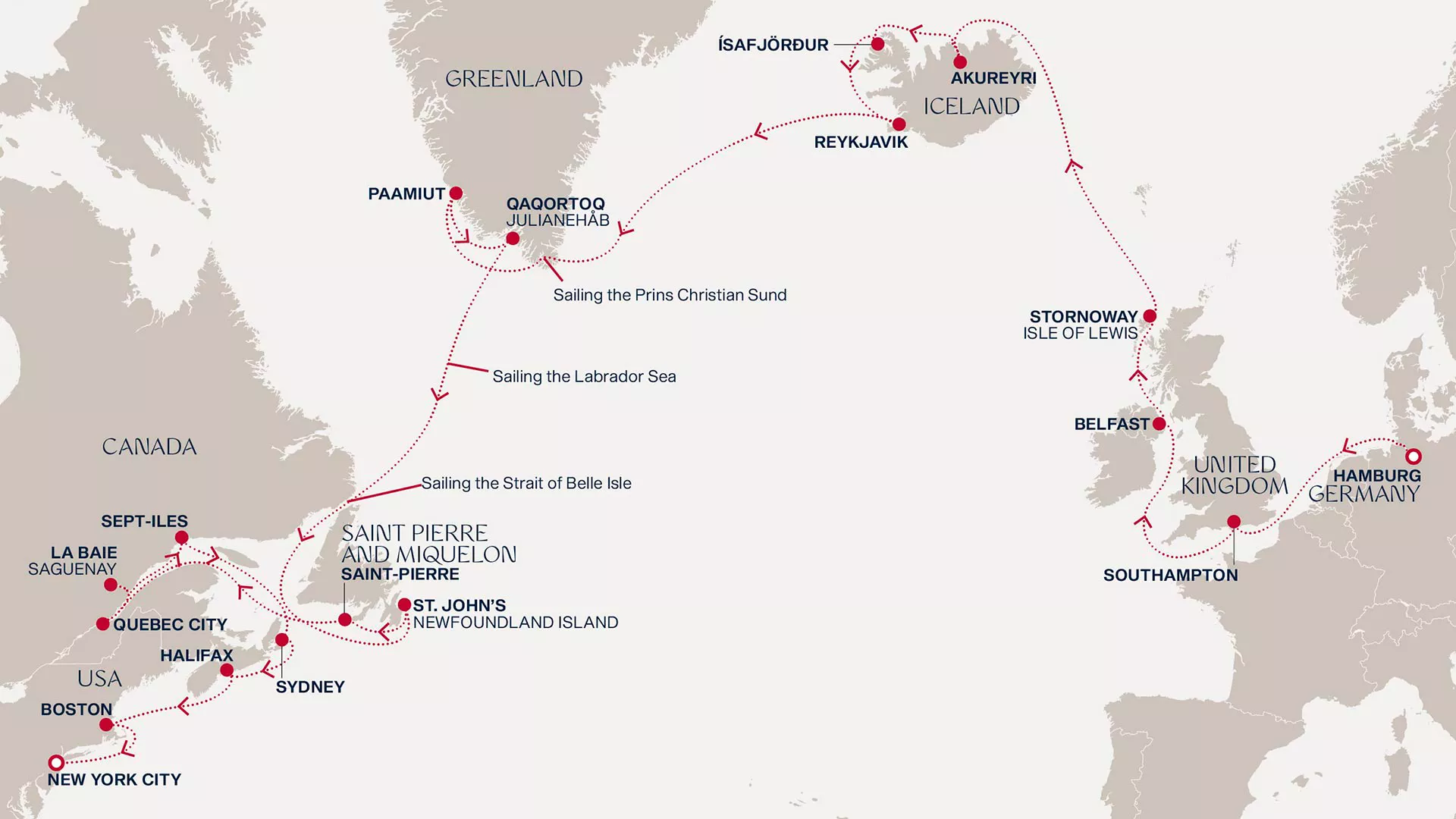 From Hamburg, sail through Southampton, Belfast, and Stornoway, where Celtic charm and rugged coasts greet you. Cross the Atlantic to Iceland’s Akureyri, Ísafjörður, and Reykjavik, alive with volcanic beauty and Nordic spirit. In Greenland, colourful Paamiut and Qaqortoq shimmer against icy backdrops before Newfoundland’s historic St. John’s and France’s Saint Pierre et Miquelon. Continue into Canada with Quebec City’s old-world grace, Saguenay’s fjords, and Halifax’s maritime heart. Conclude with Boston’s heritage and New York’s iconic skyline.