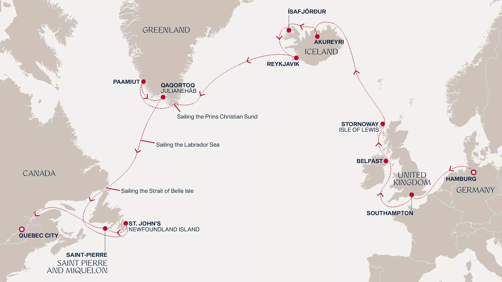 Depart from Hamburg and sail to Southampton, Belfast, and Stornoway, where Celtic spirit and island traditions linger. Crossing the North Atlantic, discover Iceland’s wonders from Akureyri’s fjords to Ísafjörður’s wild edges and Reykjavik’s vibrant energy. Glide through the Prince Christian Sound into Greenland, where Paamiut and Qaqortoq reveal colourful villages framed by glaciers. Journey onward to Newfoundland’s storied St. John’s, Saint Pierre et Miquelon, and finally Quebec City’s old-world charm.