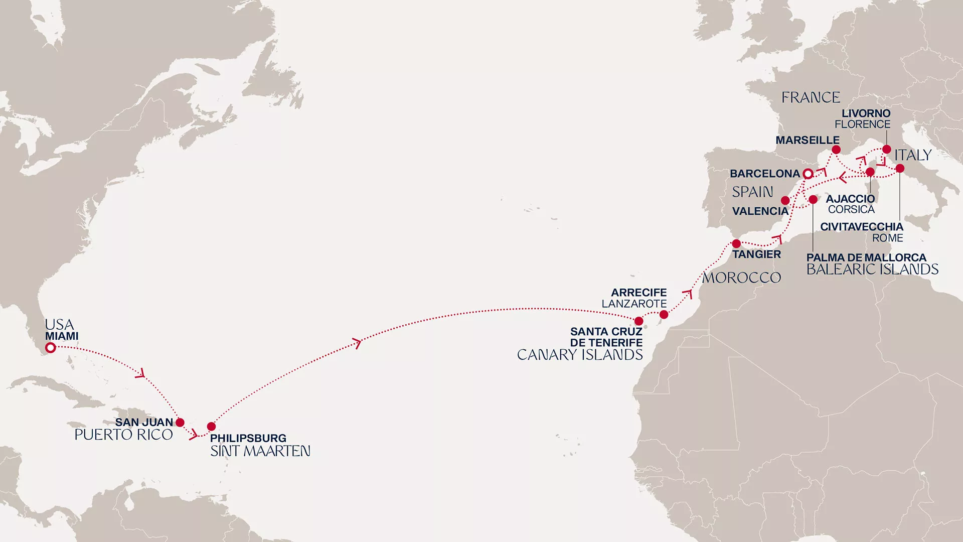 Weave together cultural, historical and scenic highlights, starting with the rhythms of Miami and San Juan, and Philipsburg’s island charm. Enjoy culinary riches and ocean-inspired wellness as we cross the Atlantic to Santa Cruz de Tenerife and Arrecife’s artistic shores. After an inspiring stop in Tangier, the journey continues toward Barcelona’s vibrant allure. Then explore Marseille’s Provençal beauty, Ajaccio’s rich past, Florence’s Renaissance wonders and Rome’s ancient glory. Valencia pulses with life, then Palma’s Balearic bliss brings your unforgettable journey to a close.