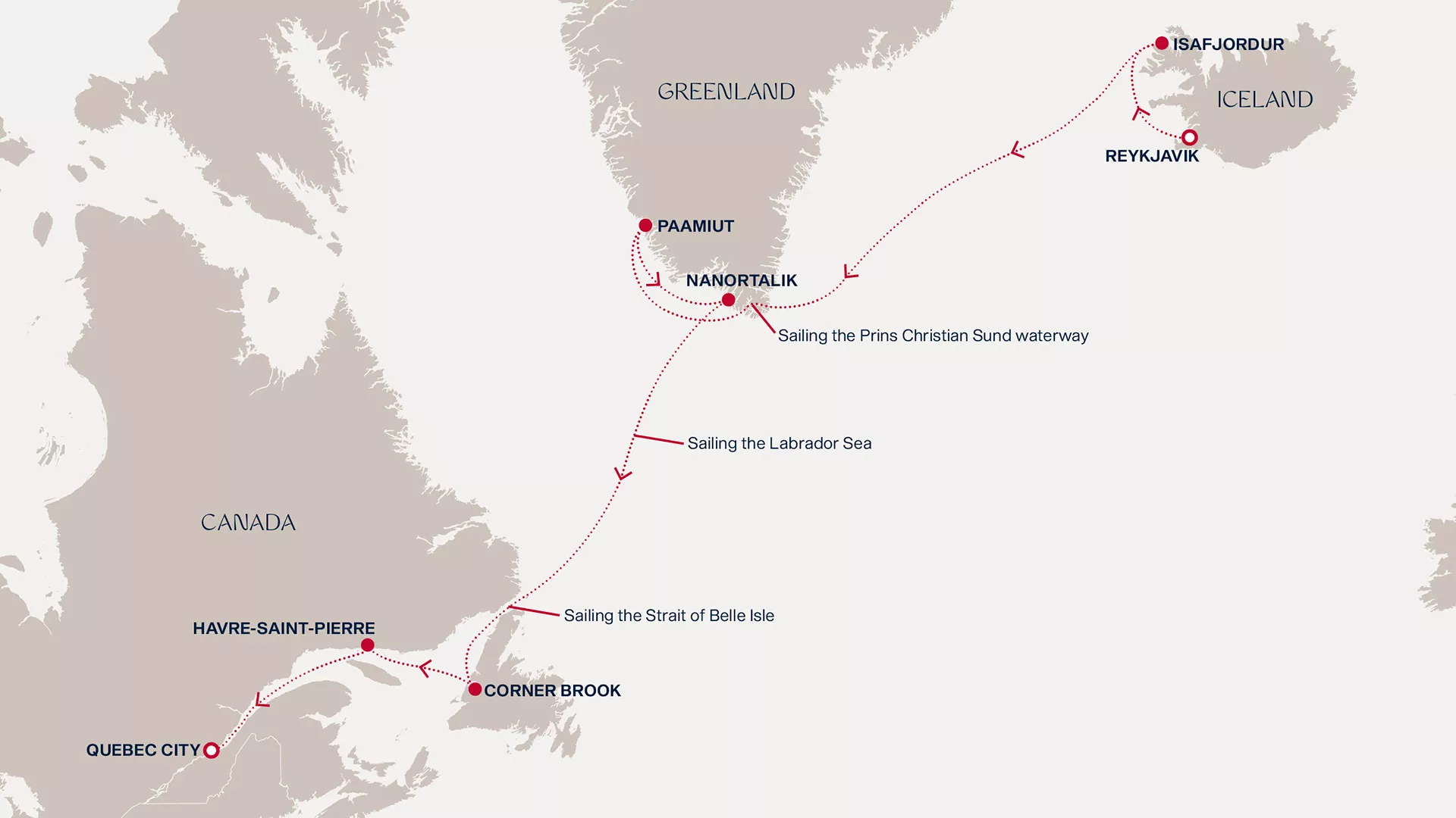Immerse yourself in a northern odyssey, beginning in Reykjavik, the world’s northernmost capital. We sail to the Icelandic haven of Ísafjörður before traversing the stunning fjords of Prins Christian Sund and discovering Paamiut’s fjords and rich Greenlandic traditions. Nanortalik’s scenic wilds beckon us for the first time, leading to Canada’s Corner Brook and Havre-Saint-Pierre, where nature’s power and beauty are on full display. Finish your journey surrounded by Quebec City’s historic wonders.