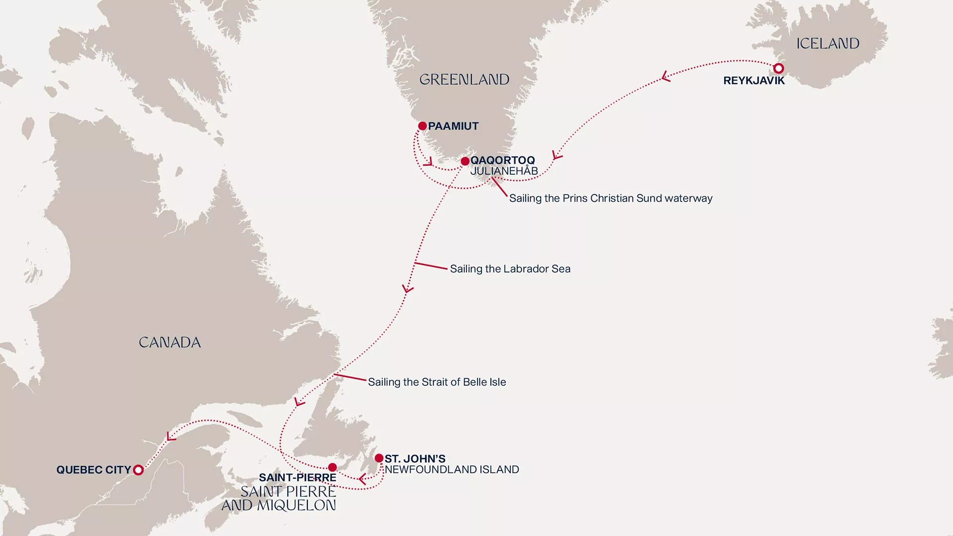From vibrant Reykjavik, drift into open seas and weave through the breathtaking Prince Christian Sound, a world of ice and stone. Trace Paamiut’s wild Greenlandic coastline, then embrace the Norse heritage of Qaqortoq. Cross the Labrador Sea and thread the Strait of Belle Isle to reach the rugged island spirit of St. John’s, Newfoundland’s striking capital. Wander the French-flavoured streets of Saint Pierre and Miquelon before a final sea day carries you to Quebec City’s old-world elegance.