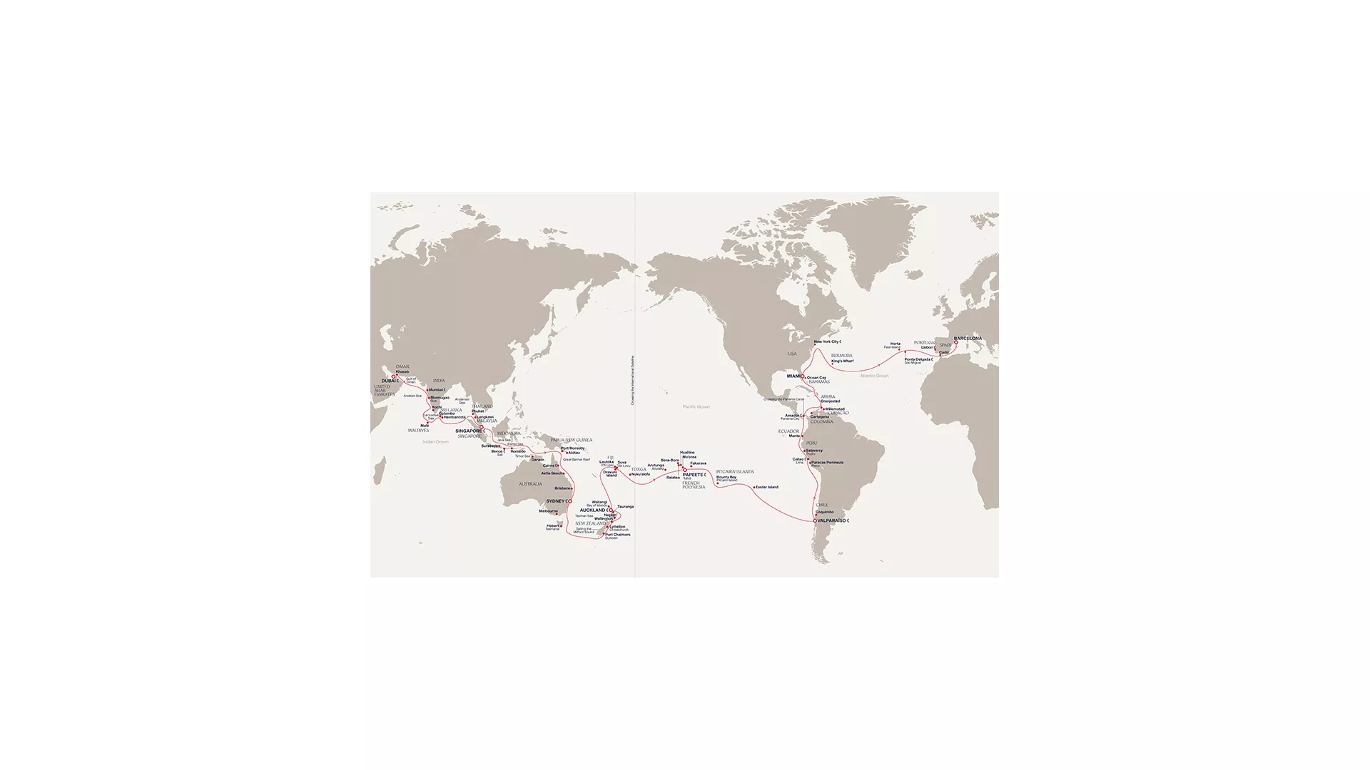 Across seven unique Passages, guests will experience the world as one continuous Journey. EXPLORA I will sail from Dubai’s golden horizons, along India’s spice-scented coasts and the iridescent seas of the Maldives, before continuing towards Sri Lanka’s sacred beauty, the vibrant pulse of Southeast Asia, and the island landscapes of Bali and Komodo. The Journey will then venture through the seas of Oceania, with unhurried time in Cairns, Airlie Beach, Brisbane, Sydney and Melbourne, before revealing the wild beauty of Tasmania and the emerald fjords of New Zealand. At the heart of the Pacific, guests will be immersed in the warmth of Fiji, the cultural richness of Tonga and the Cook Islands. The turquoise waters of French Polynesia invite moments of serenity, as an ocean breeze yields to the enigmatic spirit of Easter Island — a once-in-a-lifetime exploration of the world’s most remote wonders. Sailing onward along the Pacific coastline of South America, EXPLORA I continues through the cultural treasures of Chile and Peru before reaching the Panama Canal, marking a defining moment as the Journey crosses from ocean to ocean. After venturing through the soul-stirring blues of the Caribbean Sea, the final Passage unfolds through the vibrant rhythms of the Americas to conclude amid the Atlantic’s remote islands of the Azores and the welcoming warmth of the Mediterranean.