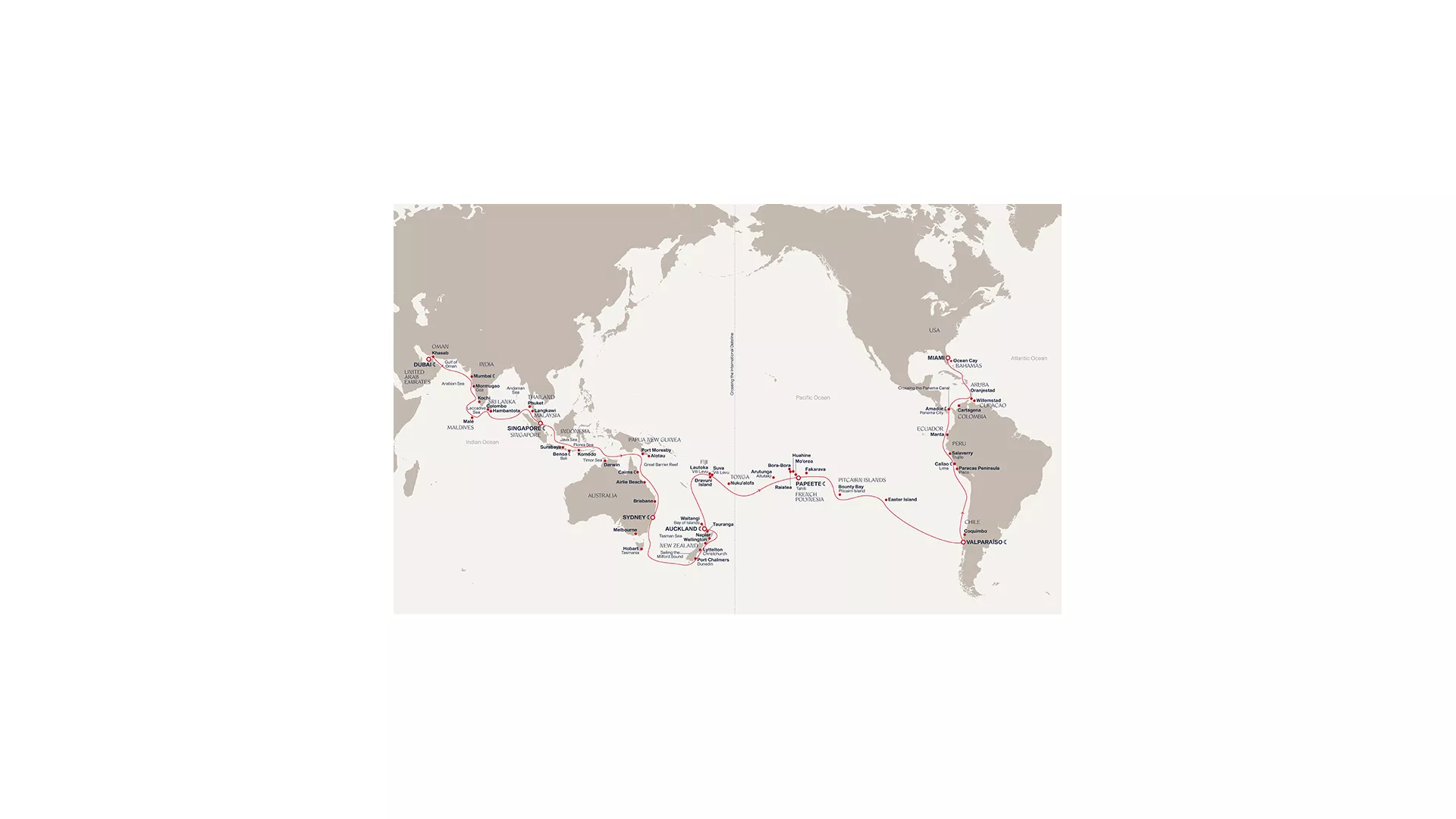 EXPLORA I will sail from Dubai’s golden horizons, along India’s spice-scented coasts and the iridescent seas of the Maldives, before continuing towards Sri Lanka’s sacred beauty, the vibrant pulse of Southeast Asia, and the island landscapes of Bali and Komodo. The Journey will then venture through the seas of Oceania, with unhurried time in Cairns, Airlie Beach, Brisbane, Sydney and Melbourne, before revealing the wild beauty of Tasmania and the emerald fjords of New Zealand. At the heart of the Pacific, guests will be immersed in the warmth of Fiji, the cultural richness of Tonga and the Cook Islands. The turquoise waters of French Polynesia invite moments of serenity, as an ocean breeze yields to the enigmatic spirit of Easter Island — a once-in-a-lifetime exploration of the world’s most remote wonders. Sailing onward along the Pacific coastline of South America, EXPLORA I continues through the cultural treasures of Chile and Peru before reaching the Panama Canal, marking a defining moment as the Journey crosses from ocean to ocean. Our Journey then carries us through the Caribbean, guided by warm currents and timeless rhythms, before concluding in radiant Miami.