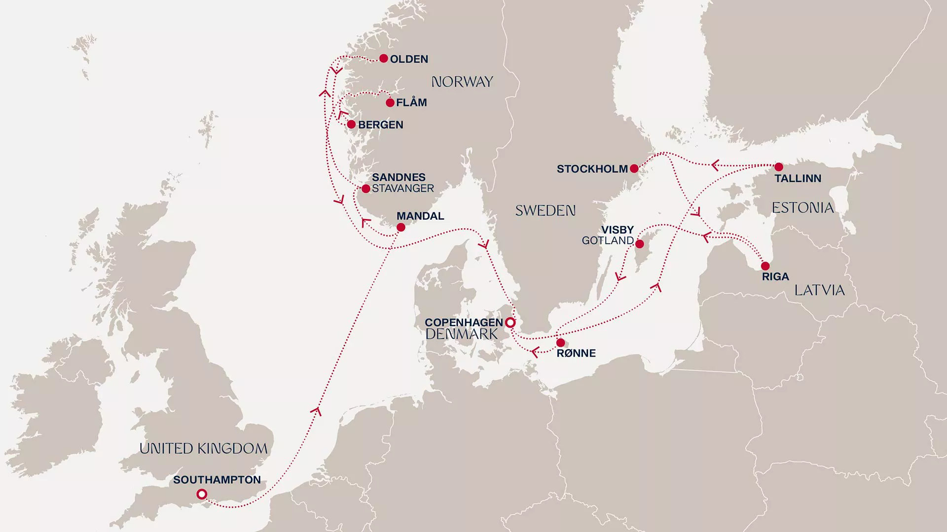 Depart Southampton for Norway’s rugged coastline, beginning in Mandal’s tranquil charm and continuing through the glacier-carved fjords of Sandnes and Olden, where nature stuns at every turn. Bergen and Flåm’s mountaintop views and waterfront bustle set the stage for Copenhagen’s vibrant culture. Head east to Tallinn’s medieval lanes, then overnight in Stockholm’s archipelago beauty. Riga’s Baltic elegance and the coastal gems of Visby and Rønne beckon, before a joyful return to Copenhagen crowns this Northern odysse