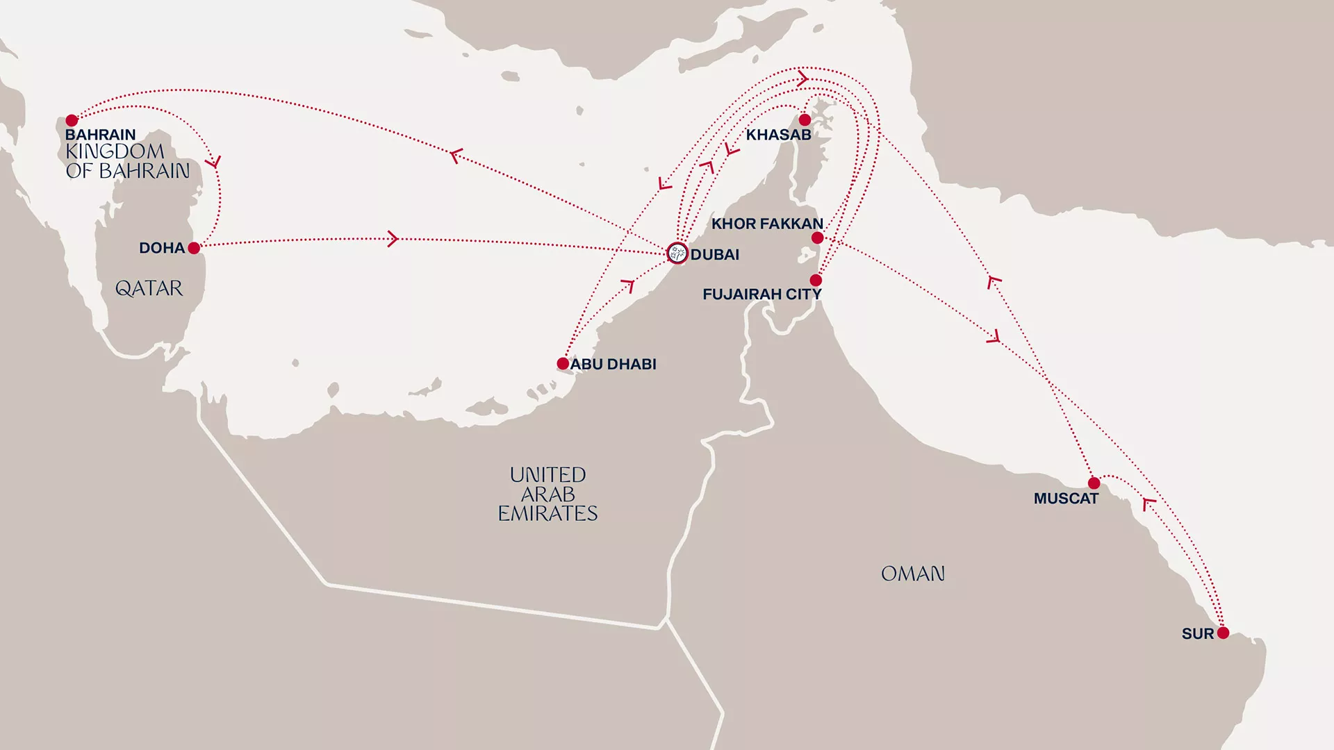 in Sur, then admire Muscat’s souks and Khasab’s fjord-like allure. From Dubai
