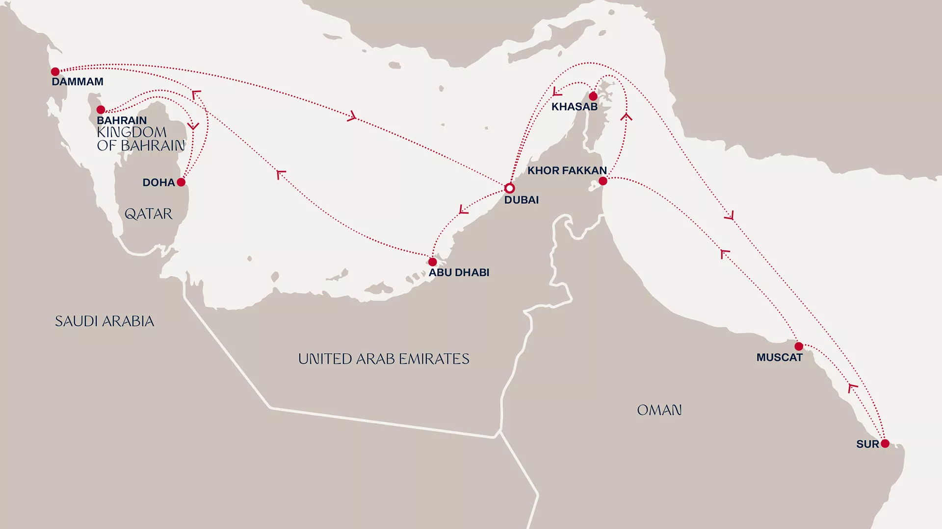 waves. After an overnight in Dubai, we follow Oman’s coast to Sur’s turquoise
