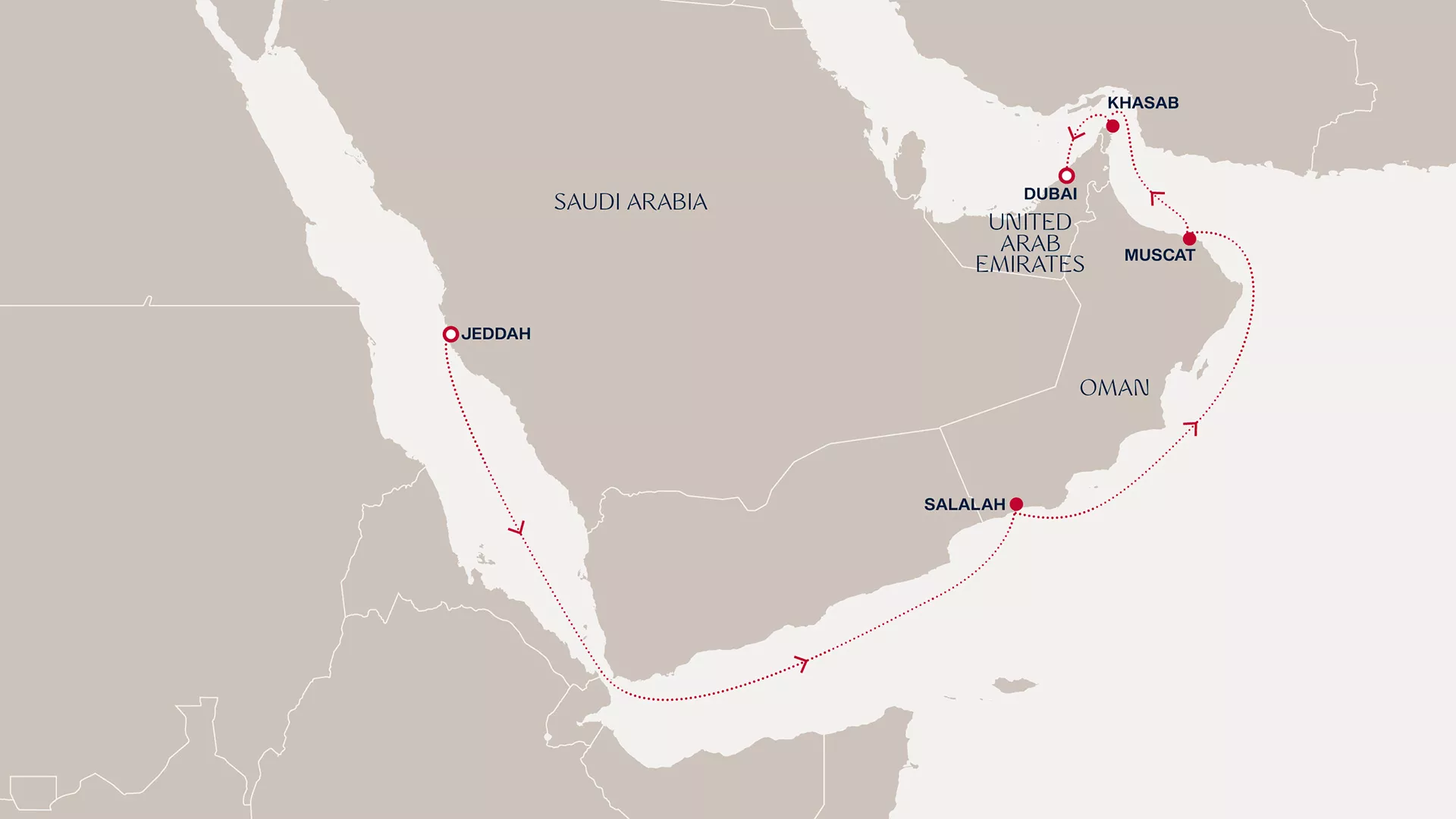 Set out from Jeddah’s enduring spirit, tracing Arabia’s time-honoured coastline southwards. Frankincense-scented landscapes, palm-lined wadis and ancient ruins unfold in Salalah, while Muscat reveals whitewashed forts, domed mosques and lively souks steeped in Omani tradition. Embrace the drama of Khasab, where fjord-like inlets and rugged peaks guard the Strait of Hormuz. Finally, witness Dubai’s striking contrasts as the dazzling cityscape slides into view.
