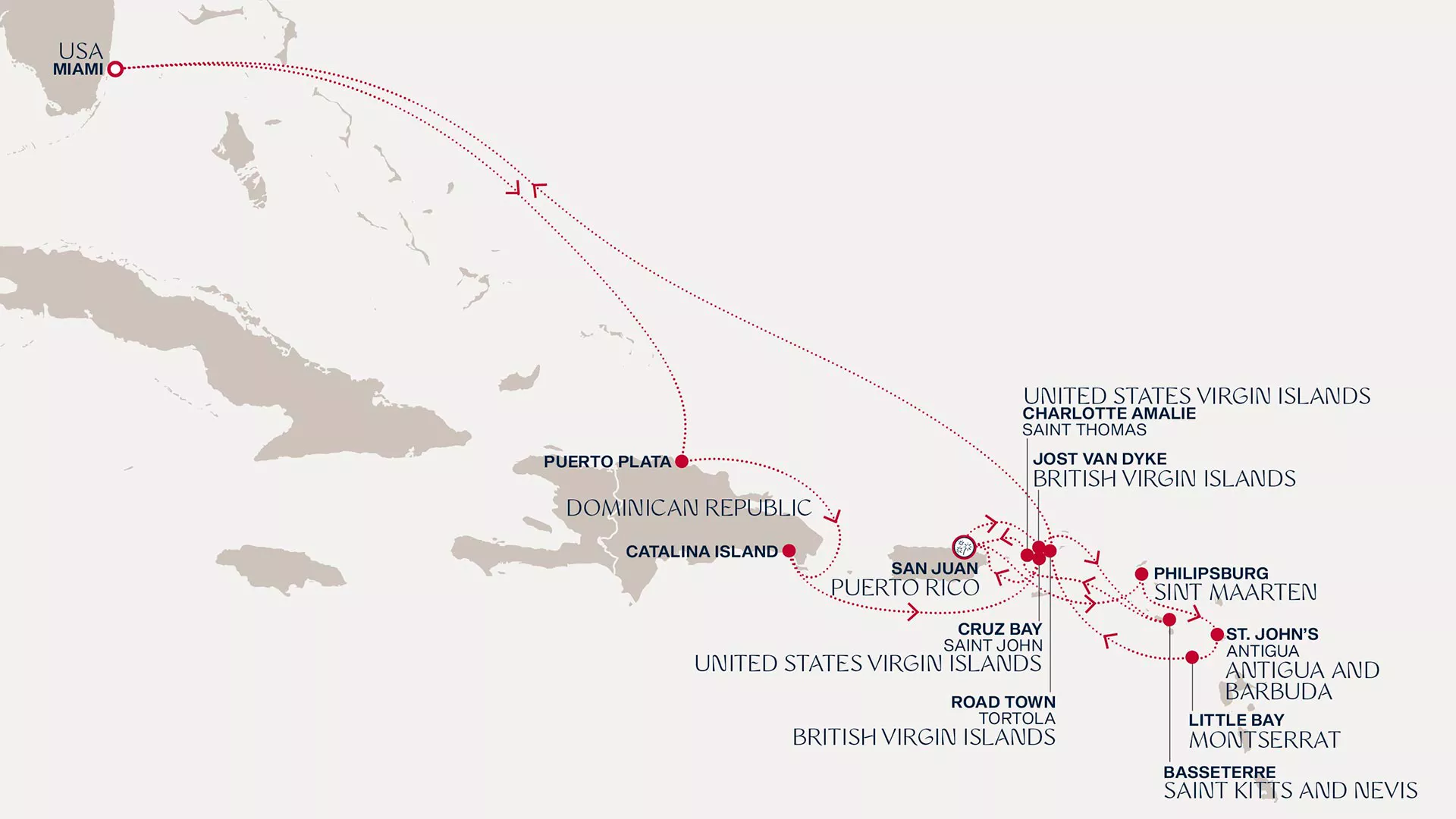 exploring Jost Van Dyke, Basseterre, Charlotte Amalie and San Juan. Then sail to Philipsburg’s colourful harbour, then Antigua’s emerald hills and golden shores. Montserrat stirs with volcanic drama, while Tortola’s hidden coves bring calm, before your journey concludes in vibrant Miami.