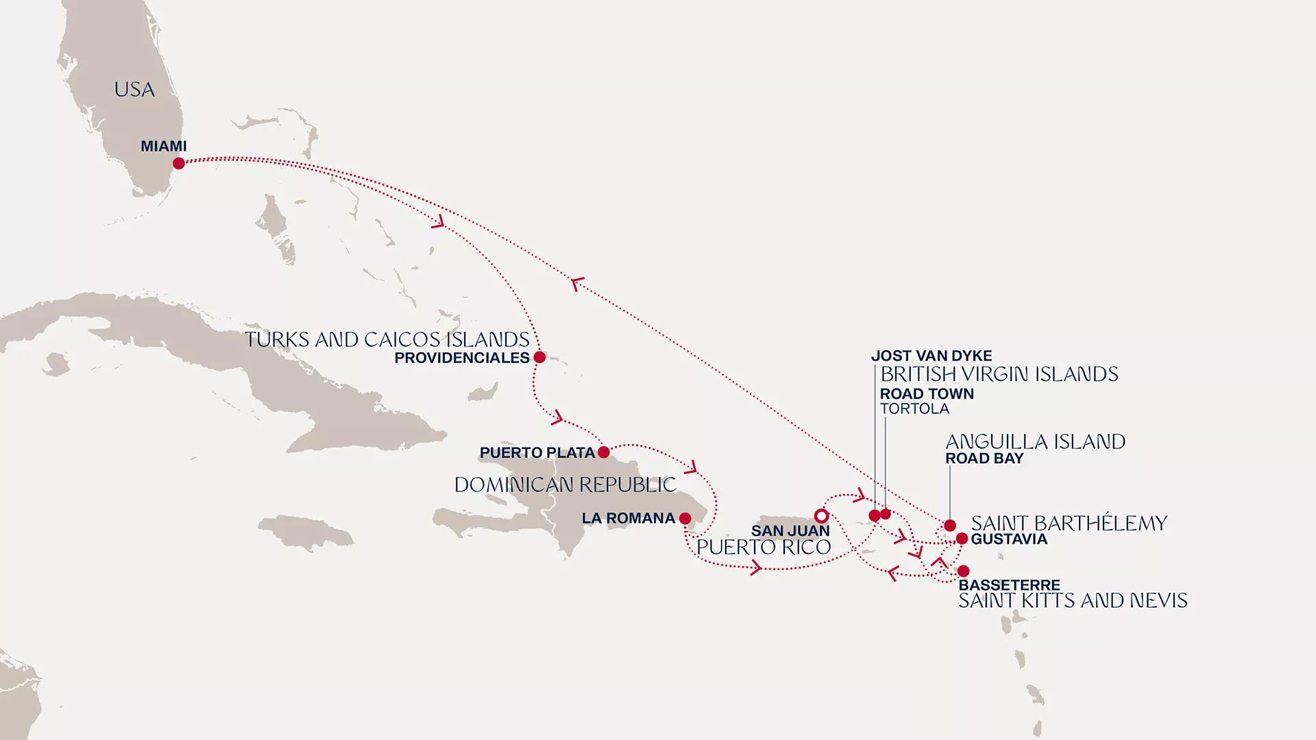 volcanic peaks. Gustavia and Anguilla offer sunlit calm that leads to Miami’s