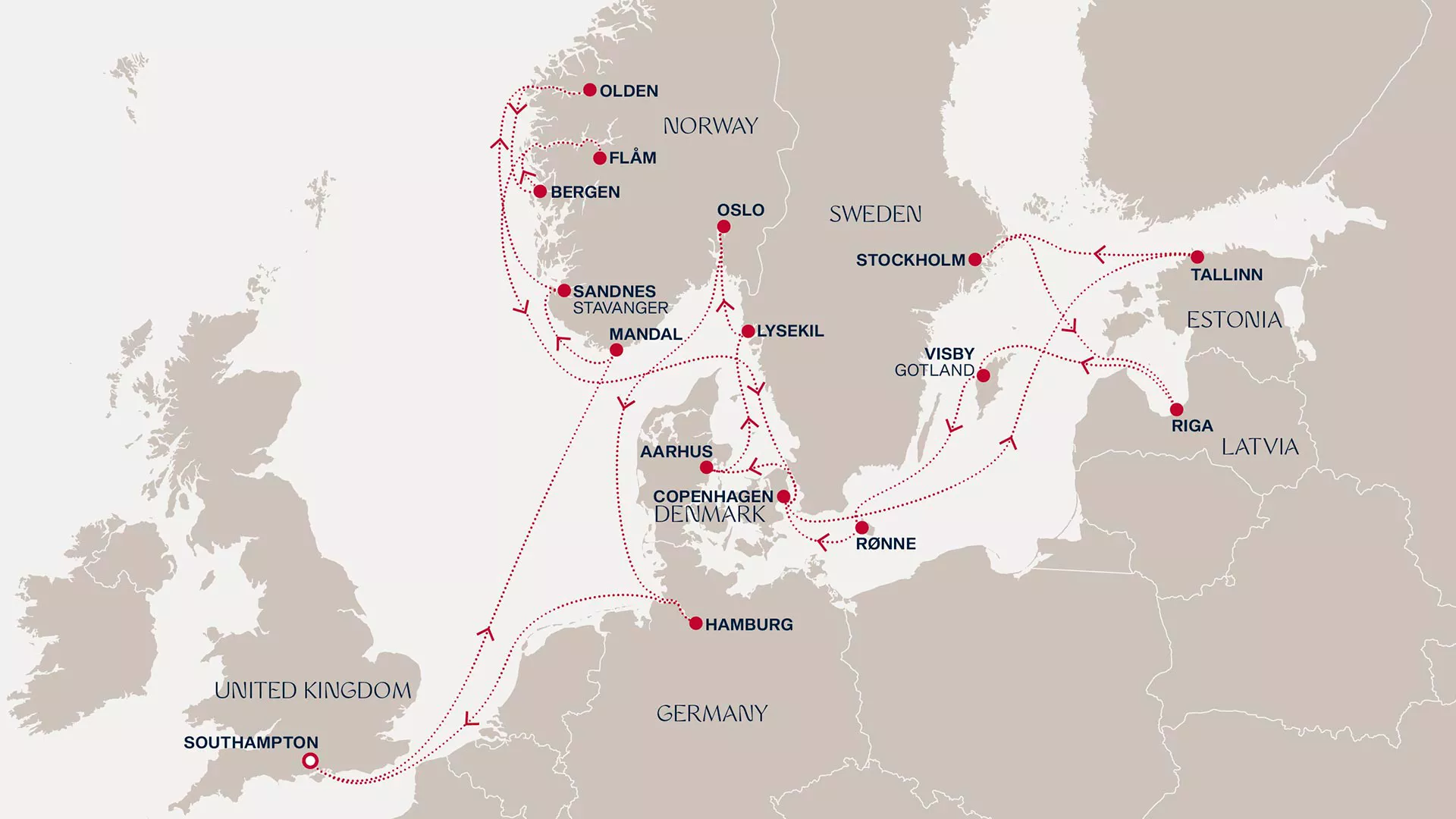 Set sail on a montage of nature and culture, leaving Southampton for Norway’s glacier-carved fjords, from Mandal’s southern charm to the dramatic peaks of Flåm via Sandnes, Olden and Bergen. Drift to Copenhagen’s welcome, Tallinn’s medieval beauty, stylish Stockholm, Riga’s ornate avenues and Visby’s historic walls. Rønne’s coastal calm and Aarhus’s creative soul lead us to Lysekil’s rocky peace, Oslo’s serenity and finally, Hamburg’s beats before returning to historic Southampton.