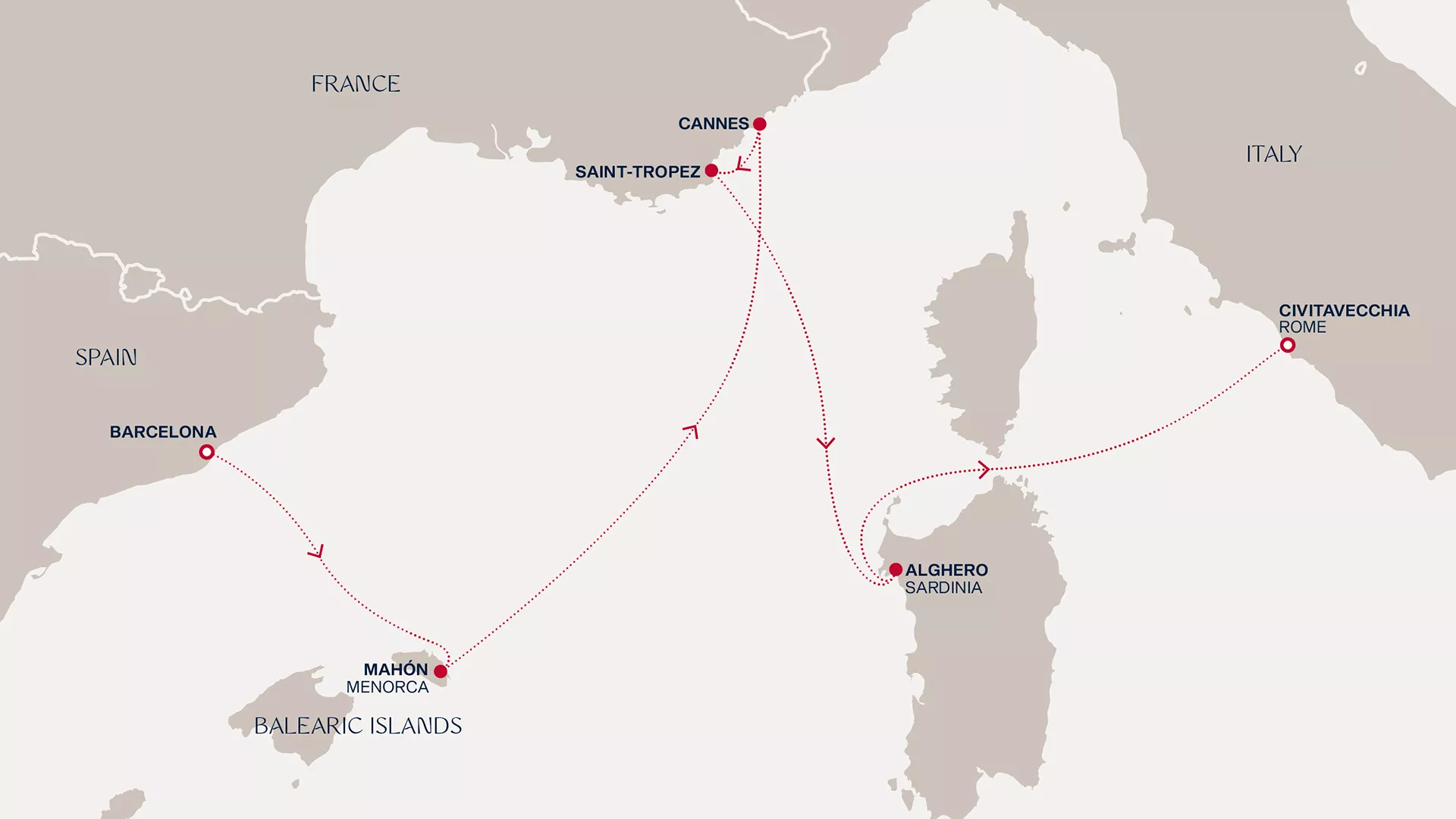 Begin your journey in the vibrant heart of Barcelona, where Catalan creativity and coastal charm give way to the unhurried lifestyle and sea-swept views of Mahón, inviting quiet exploration. Along the French Riviera, discover the cinematic charm of Cannes and the sunlit glamour of St Tropez, each offering a distinct taste of Mediterranean elegance. In Alghero, the rugged beauty of Sardinia’s Coral Coast reveals a land rich in tradition and natural wonder. Your journey culminates in Rome, where layers of history and culture unfold, from ancient landmarks to Renaissance treasures.