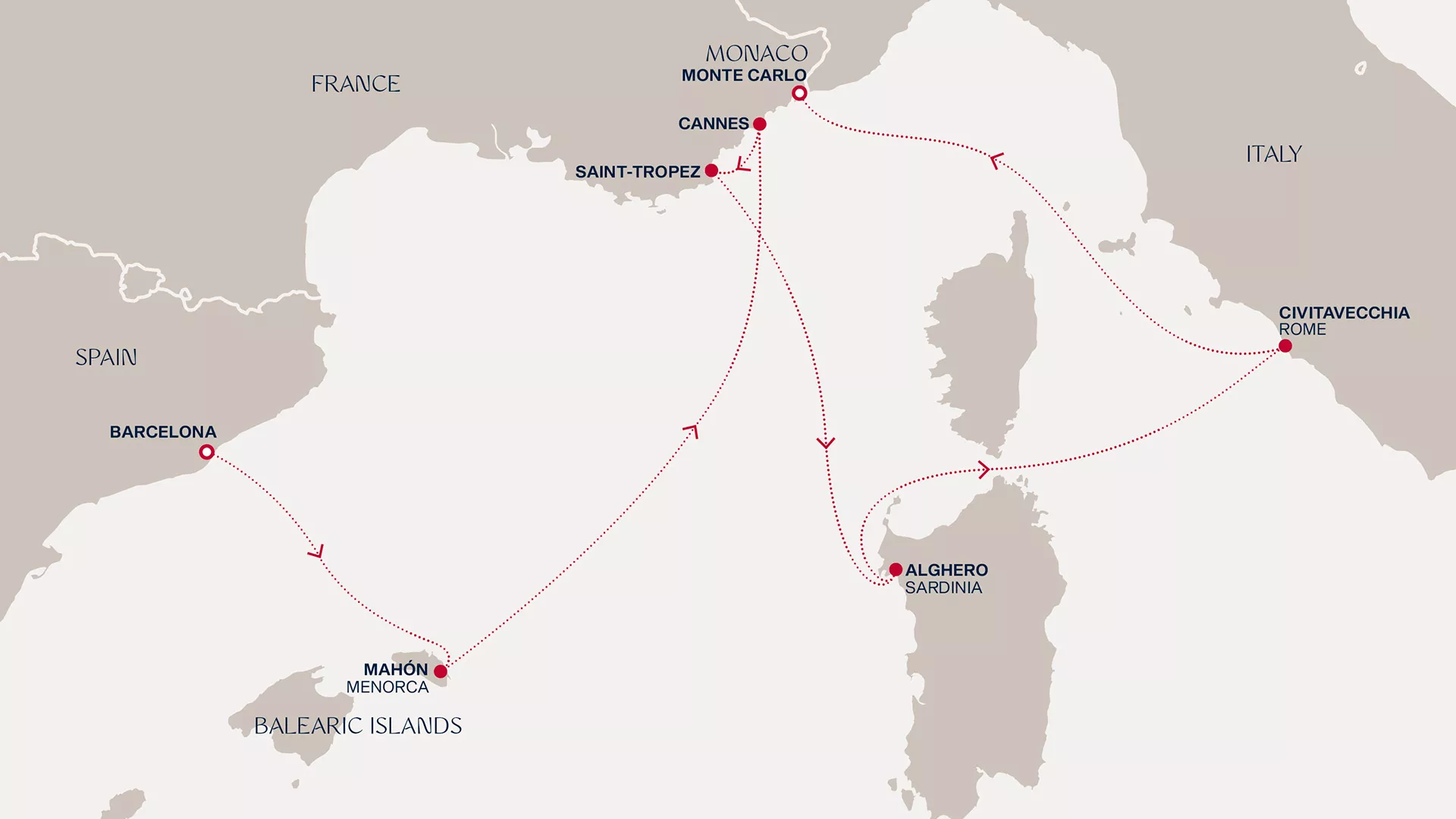 Set sail from the colourful soul of Barcelona to glide into Mahón’s leisurely lifestyle and tasty artisan delicacies. The iconic Riviera backdrop of glamorous Cannes welcomes you to winding streets and leafy hills before you absorb the jet-set glamour of sun-dappled St Tropez. In Alghero, immerse yourself in the Coral Coast and discover breathtaking Sardinian secrets. Go back in time in Rome's forum and colosseum before concluding our journey in the glamour of Monte Carlo.