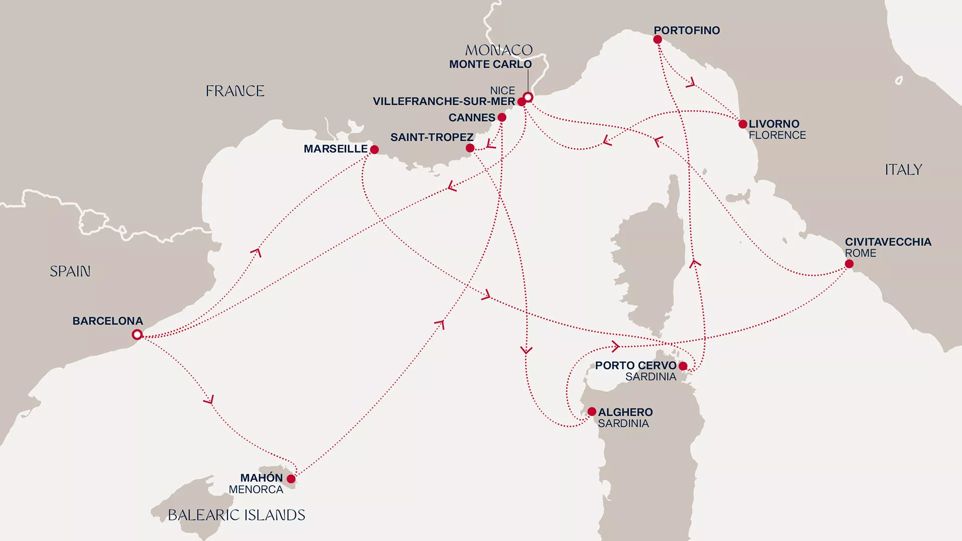 From Barcelona’s creative pulse, we sail to Marseille’s hidden coves, Porto Cervo’s glittering Costa Smeralda, Portofino’s colourful harbour and Florence’s artistic wonders. Drift along the Côte d’Azur to Nice’s elegant Riviera glamour, then onwards to Barcelona's pulse and Mahón’s relaxed charm. Winding lanes lead us through Cannes, then to the sparkle of St Tropez and Alghero’s coral-fringed coast. Afterwards, discover Renaissance art and charming cobblestone streets in Rome, before we close this journey in the glamour of Monte Carlo.