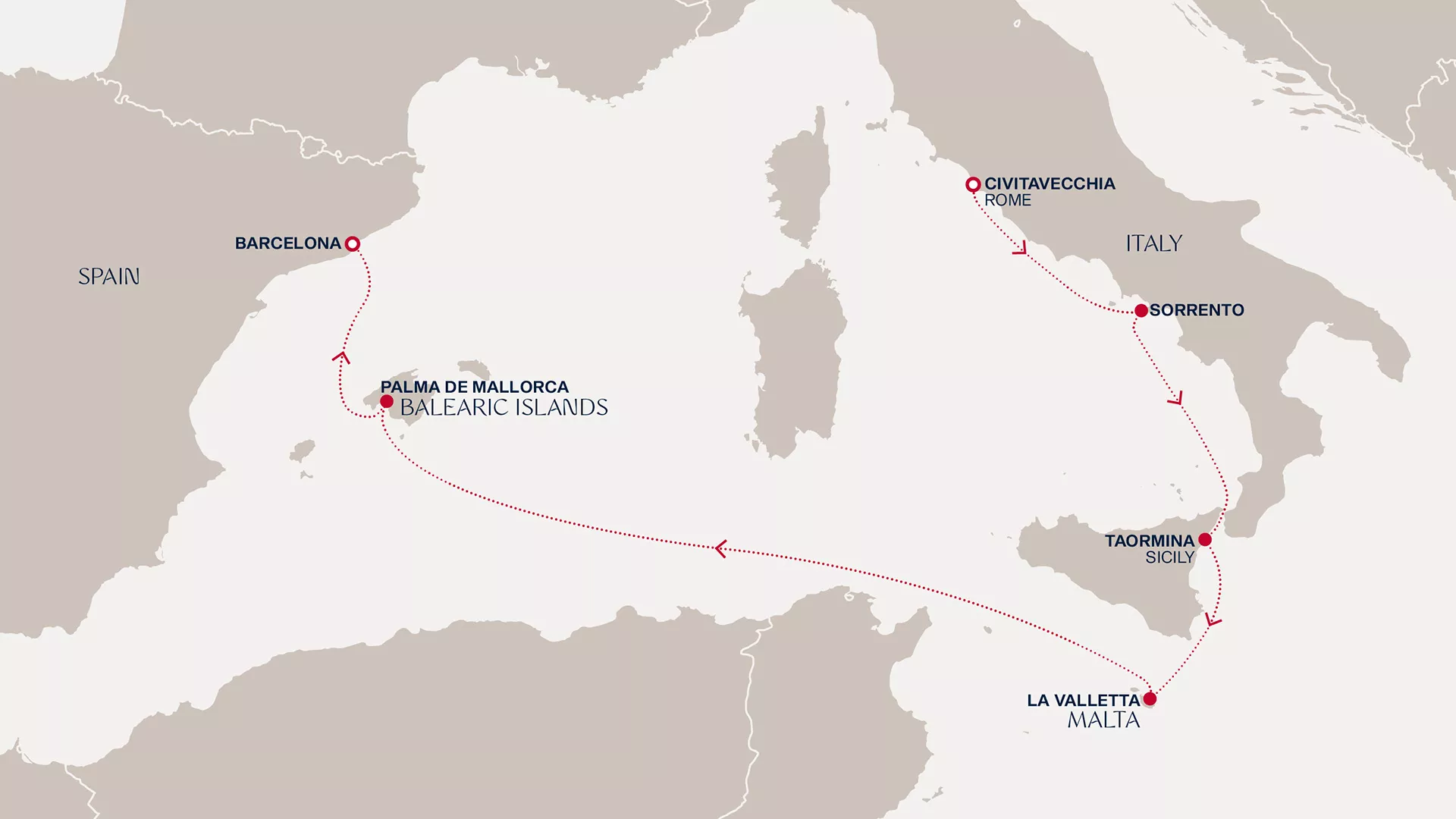 distant slopes of Mount Etna. Continue east to Valletta, Malta’s golden-hued