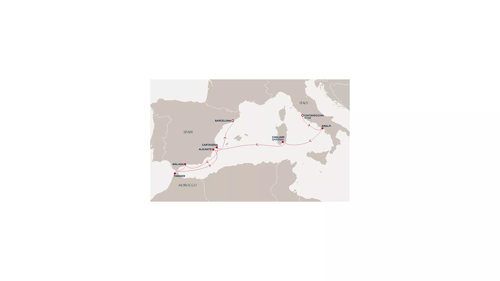 Begin in Rome before Amalfi’s dramatic cliffs and coastal beauty set a striking tone. Sardinia’s Cagliari offers a blend of history and sunlit shores, followed by a peaceful day at sea. Discover Cartagena’s layered past, then slow the pace as we pause for two days in Málaga, where Andalusian warmth and culture unfold at a relaxed pace. In Tangier, Africa’s vibrant spirit meets European influence, before a final sea crossing leads to Alicante’s easy charm and a stylish finale in Barcelona.
