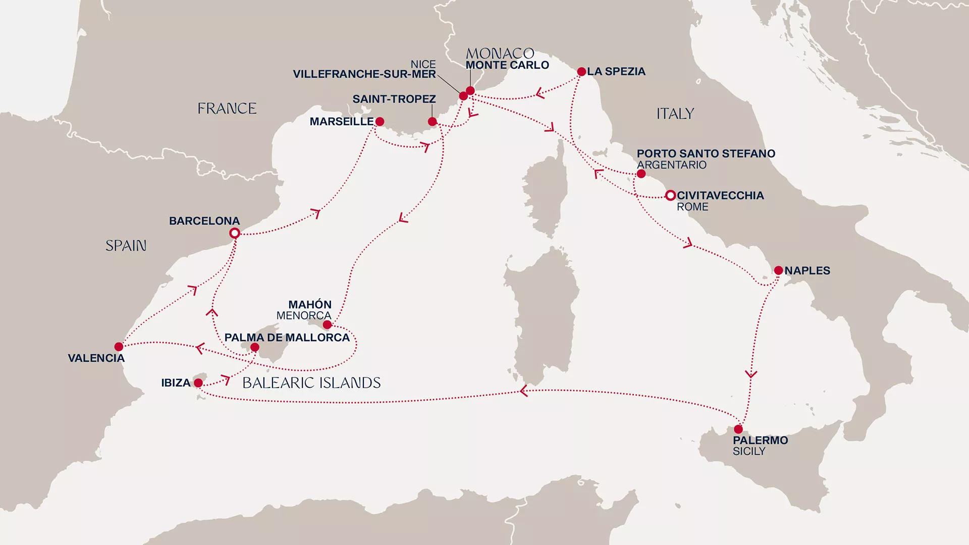 the heritage of Naples and Palermo, Ibiza’s rhythm and Palma’s island beauty,