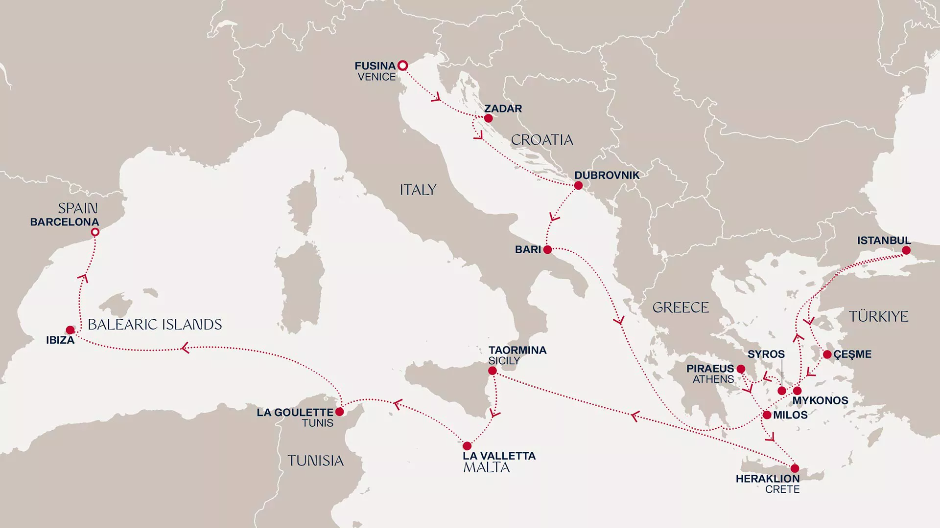 explore Athens’ ancient soul. Milos and Crete shine with Greek splendour, while Taormina, Valletta