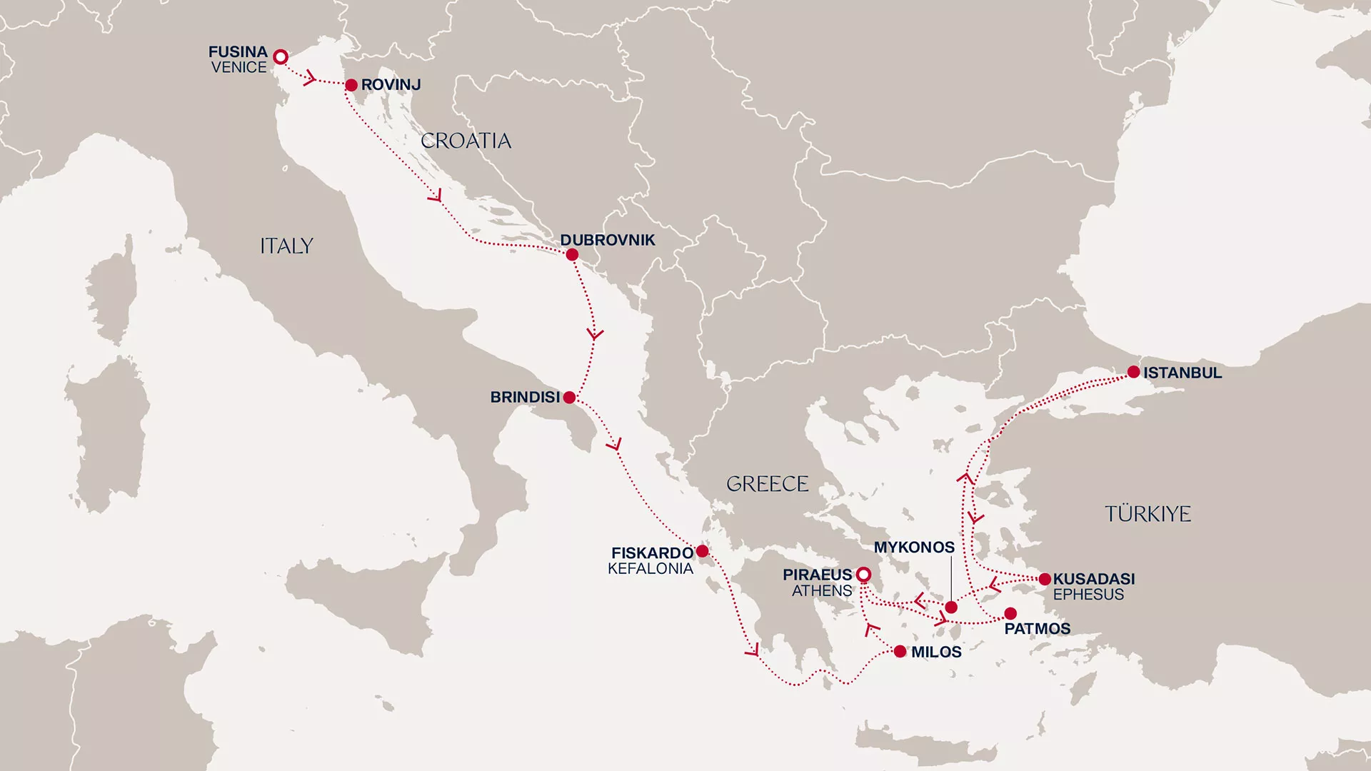 Brindisi. Explore Fiskardo’s Ionian beauty before Milos' iconic cliffs captivate you. From Athens, journey to Patmos’