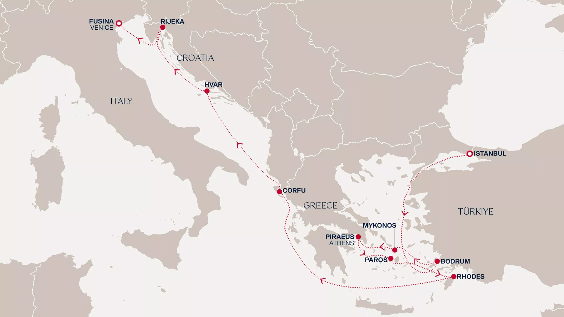 Begin amidst Istanbul’s Bosphorus views and leafy avenues. Drift to Bodrum’s sparkling bays and Mykonos’ sun-warmed lanes and ancient sites. Athens enchants with bustling squares and breezy promenades, then onwards to Paros’ olive-strewn hills and Rhodes’ fortified ramparts. Glide past Corfu’s emerald slopes, Hvar’s glistening waters and Rijeka’s Adriatic energy before Venice opens in a lattice of sparkling canals and piazzas.