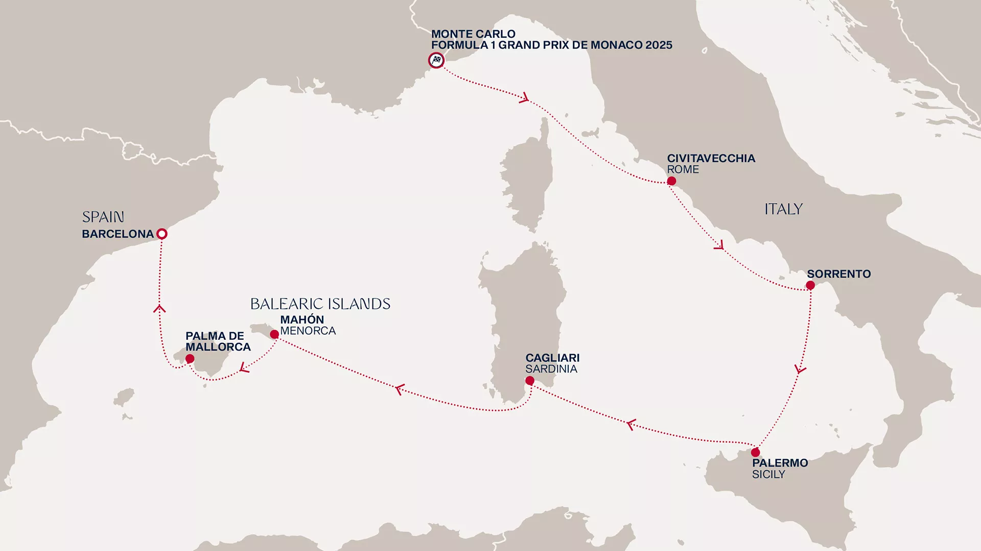 The Formula 1® and cool down experience: starting this journey, EXPLORA II will be the only luxury ship docked in Port Hercule during the FORMULA 1 GRAND PRIX DE MONACO 2025, providing guests with the perfect opportunity to immerse themselves in the legendary event.  From Monte Carlo, we sail for the Caput Mundi, capital of the world, Rome, and Sirrentum, Sorrento, the land of sirens. Floating like dreams, Sicily and Sardinia, with gelato, café-lounging can be immediately beguiling, just as Menorca, a natural haven.​