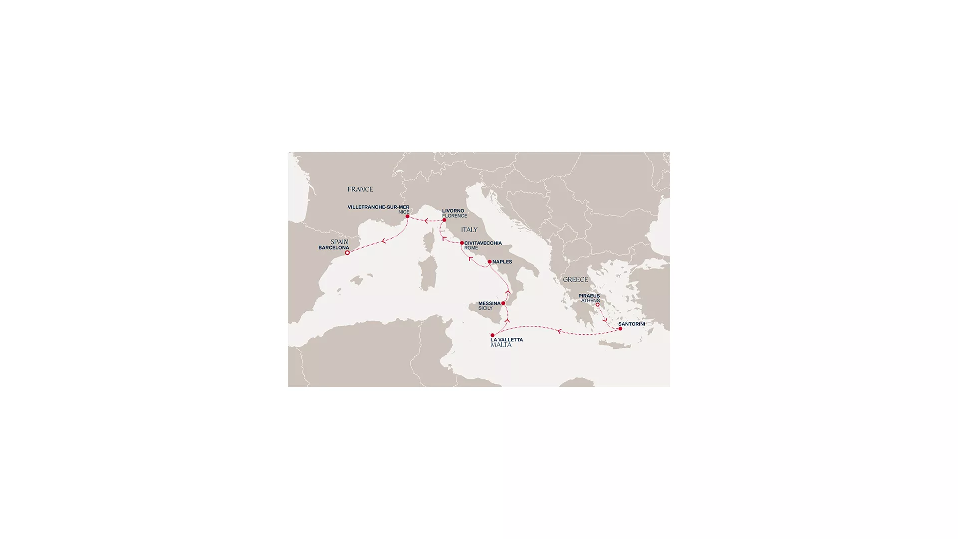Begin in Athens before Santorini’s dramatic setting introduces the Aegean’s distinctive character. Sailing west, Valletta’s compact grandeur and Messina’s gateway to Sicily reveal layers of Mediterranean history, followed by Naples’ energy and depth. Rome and Florence offer a rich immersion in art and heritage, before the coastline softens into the Riviera in Villefranche-sur-Mer. A final day at sea creates a gentle pause before arriving in Barcelona, where creativity and coastal life meet.