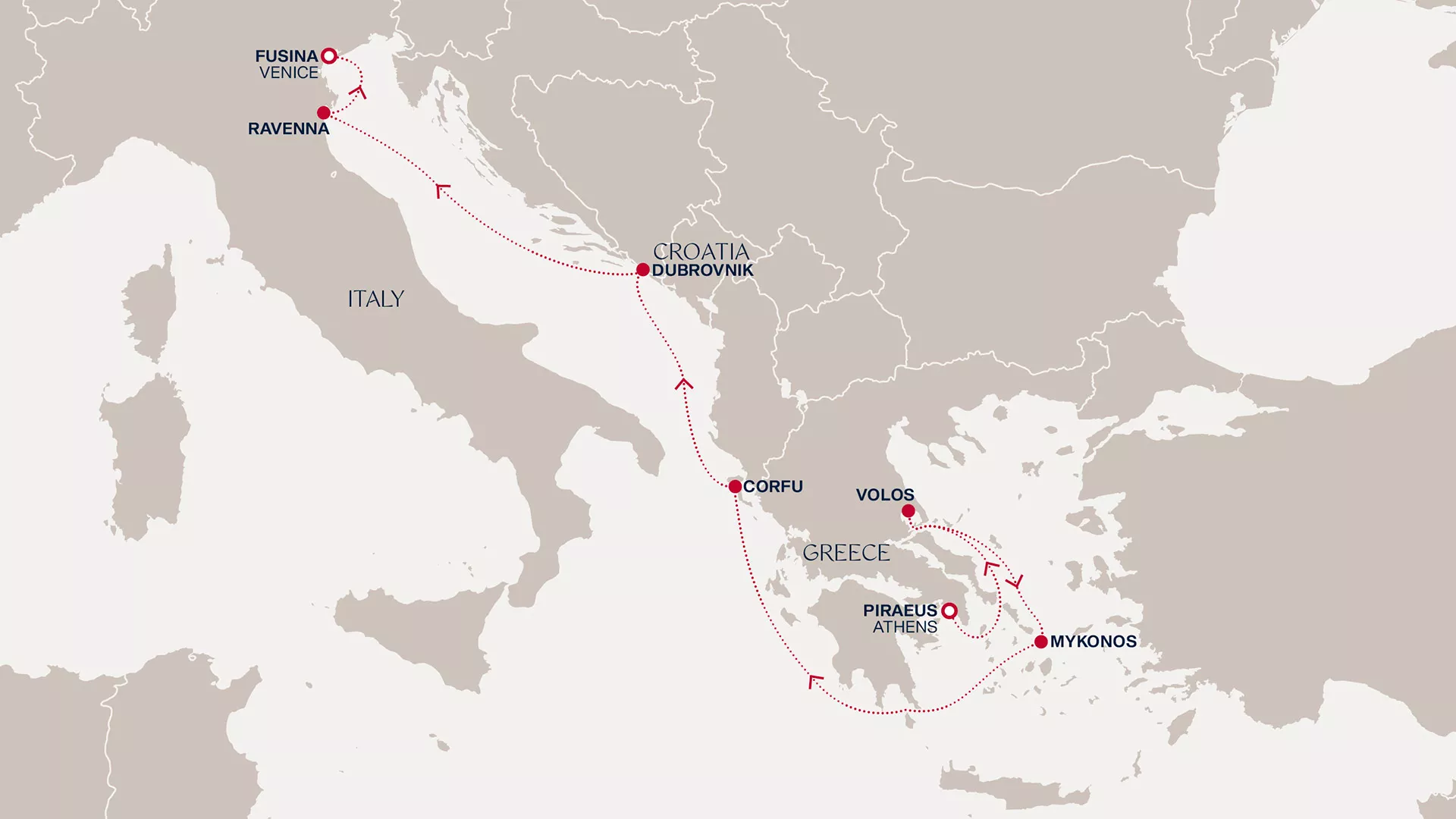 Sail from Athens, where ancient wonders inspire the journey ahead. In Volos, discover the myths of Mount Pelion before drifting to Mykonos with its whitewashed alleys and vibrant spirit. After a day of serenity at sea, embrace Corfu’s Venetian charm and Dubrovnik’s storied walls. Conclude among Italy’s treasures, from Ravenna’s glittering mosaics to the timeless elegance of Venice.