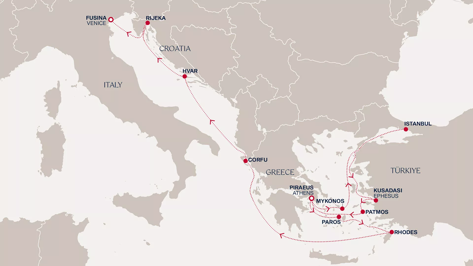 Begin Athens, where ancient wonders and vibrant life set the tone. Mykonos sparkles with Cycladic charm before a serene day at sea carries you to enthralling Istanbul, where continents and empires intertwine. Explore Ephesus and the spiritual calm of Patmos, then return to Athens before discovering Paros’ easy elegance and Rhodes’ medieval grandeur. After a restful sea day, Corfu and Hvar enchant, Rijeka delights, and Fusina offers a graceful gateway to Venice’s timeless canals.