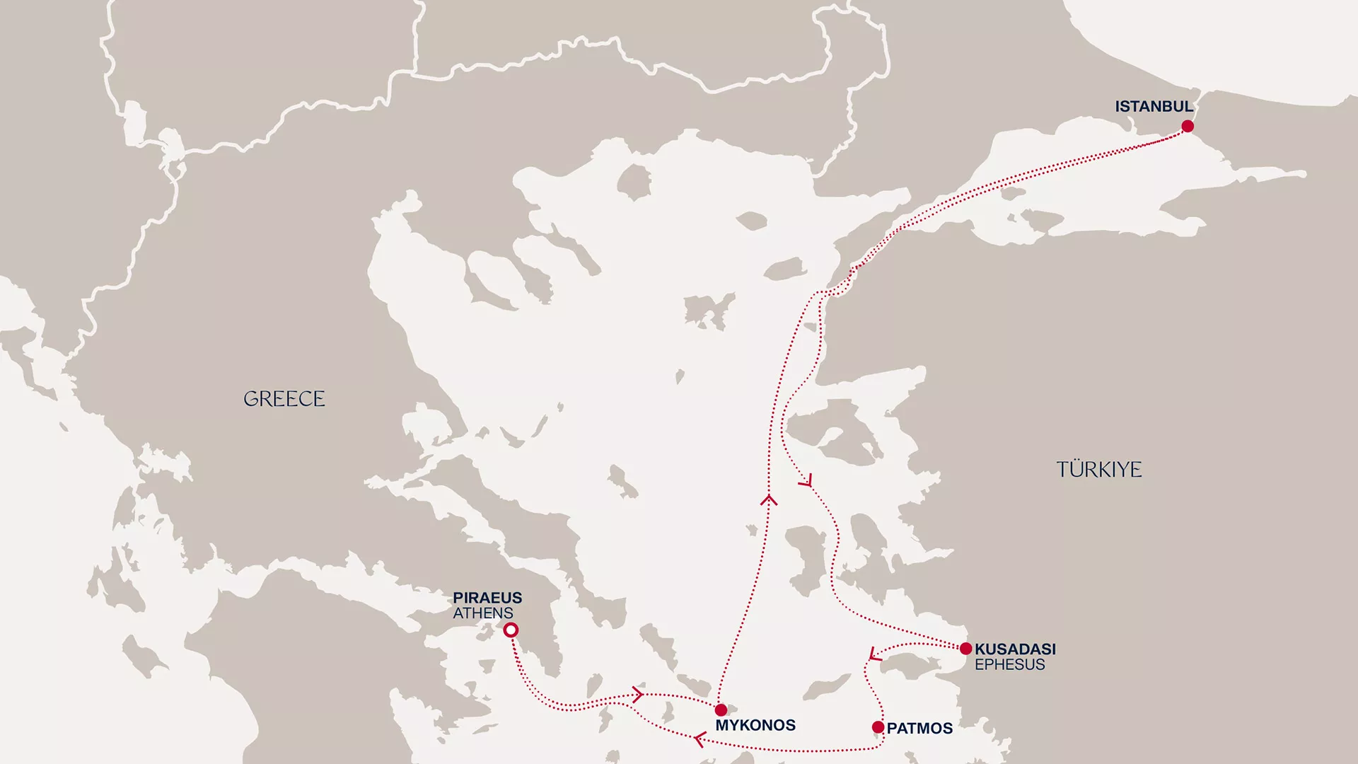 Begin in Piraeus, gateway to Athens’ ancient marvels, before Mykonos sparkles with sunlit glamour and Cycladic charm. A peaceful day at sea carries you to captivating Istanbul, where domes, minarets, and grand bazaars reveal centuries of imperial splendour across two continents. Explore the remarkable ruins of Ephesus from Kusadasi, then discover the spiritual serenity of Patmos. Return to Athens enriched by a voyage shaped by mythology, history, and the timeless allure of the Aegean.