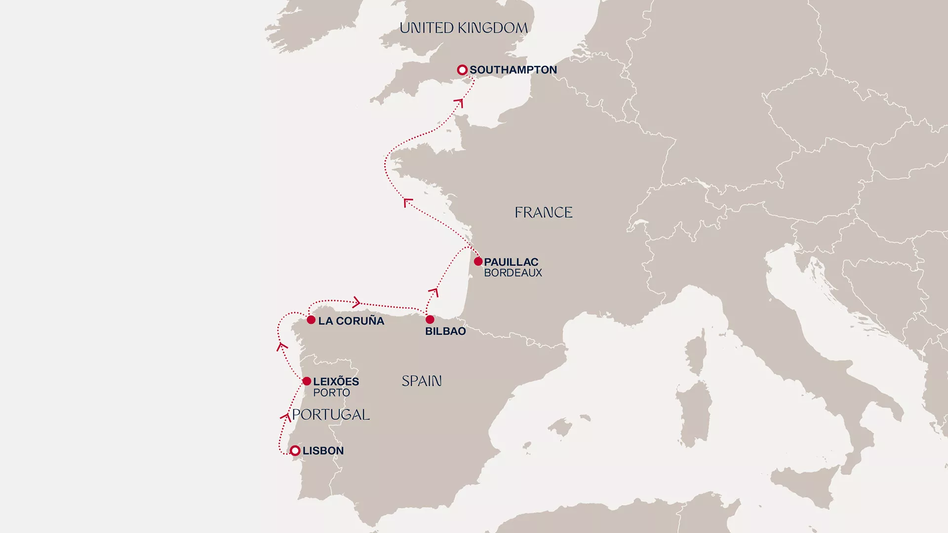 Set sail from soulful Lisbon to reach Leixões, gateway to Porto’s riverside charm and tiled facades. Discover the glass-fronted galleries, ocean views and lively old streets of La Coruña before Bilbao stirs us with art, culture and buzzing pintxo bars. Deep in Bordeaux’s wine country, raise a glass to the spectacular sunset and enjoy a relaxing overnight stay. A day at sea brings quiet blue horizons and a chance to recharge in tranquillity, before vibrant Southampton marks our journey’s end.